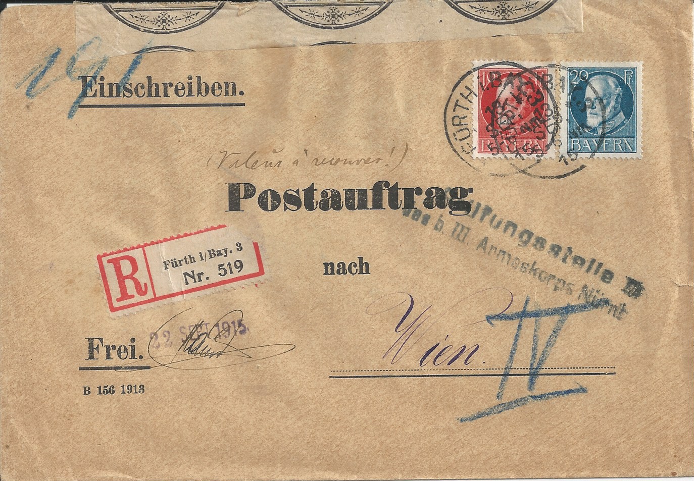 Postauftrag aus Fürth vom 18.Sep.15 nach Wien. Zensur durch die Prüfungsstelle II des III. Armeekorps Nürnberg.