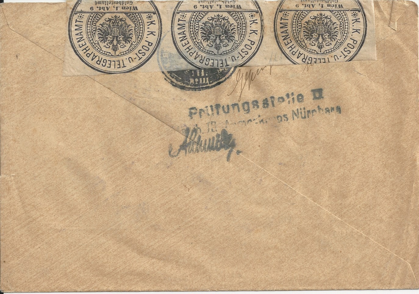 Auf der Rückseite ist noch ein nicht lesbarer Negativstempel. Der Brief wurde in Wien geöffnet und verschlossen.