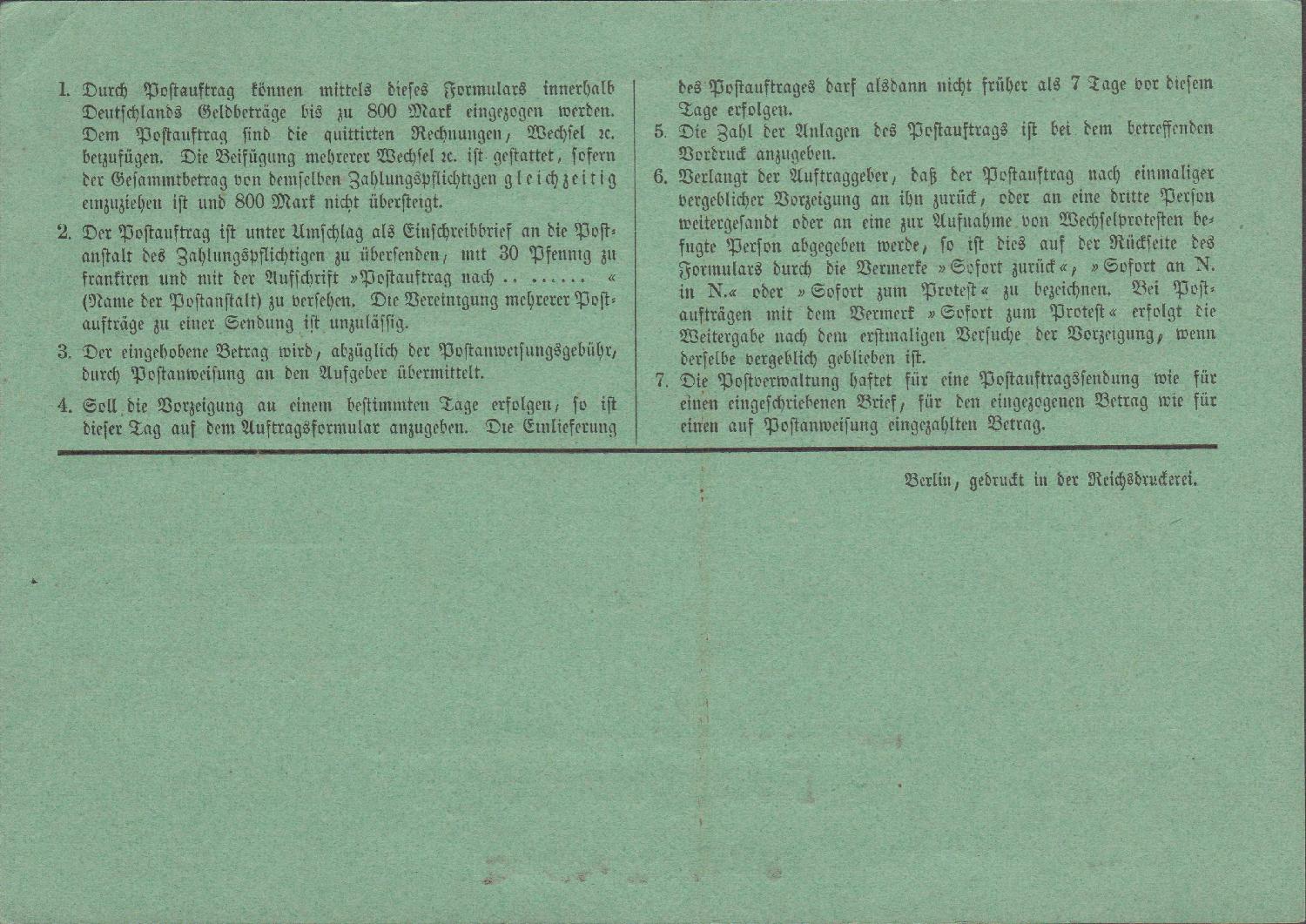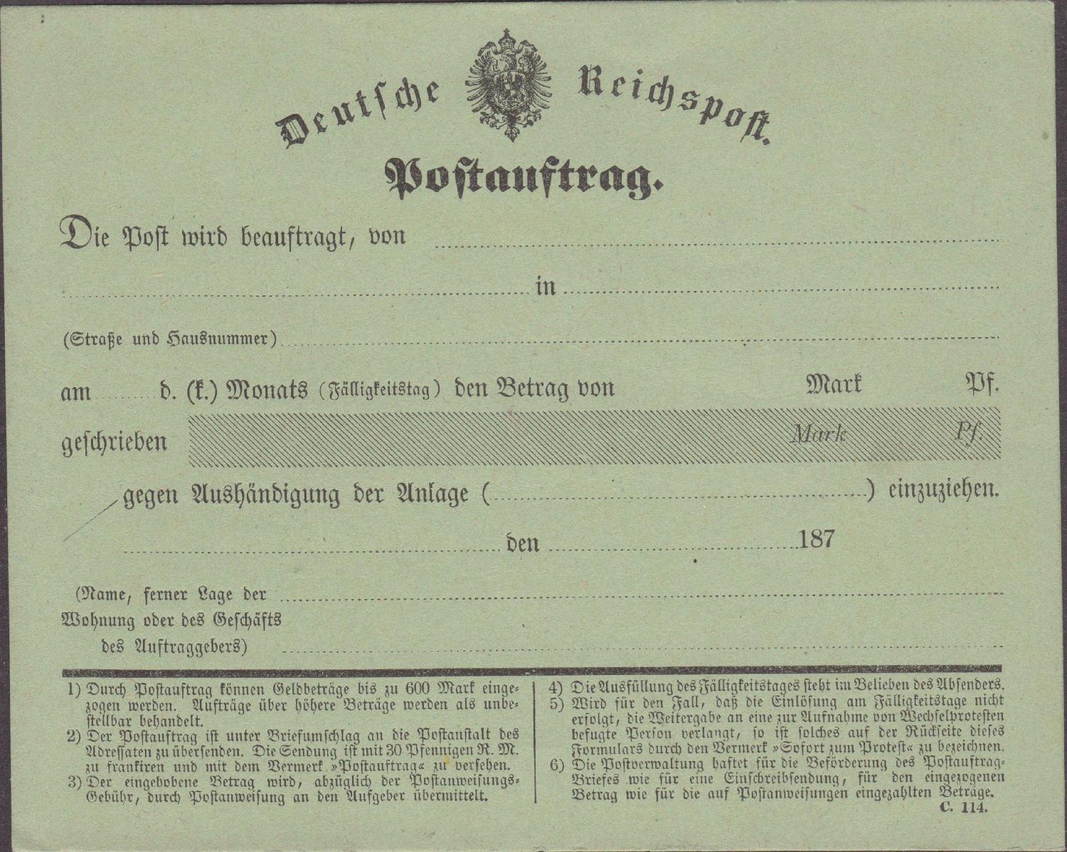 In den Zeiten der Reichspost mußte der Absender eine Postauftragskarte ausfüllen. Der Postauftrag wurde an das Bestimmungspostamt versandt. Dieses hat dann vom Zahlungspflichtigen den Geldbetrag gegen Vorzeigen des Postauftrages und Aushändigung der quittierten Anlagen eingezogen oder die schriftliche Annahmeerklärung eingeholt. Der eingezogene Betrag wird dem Absender durch Postanweisung oder Überweisung übermittelt, bzw. die Annahmeerklärung dann zugesandt (in der Regel als Einschreiben). Bei Postprotestaufträge war eine gesonderte Postauftragskarte vom Absender auszufüllen.