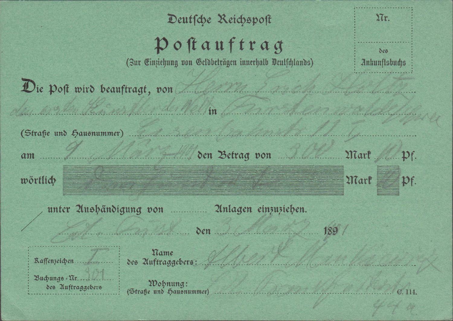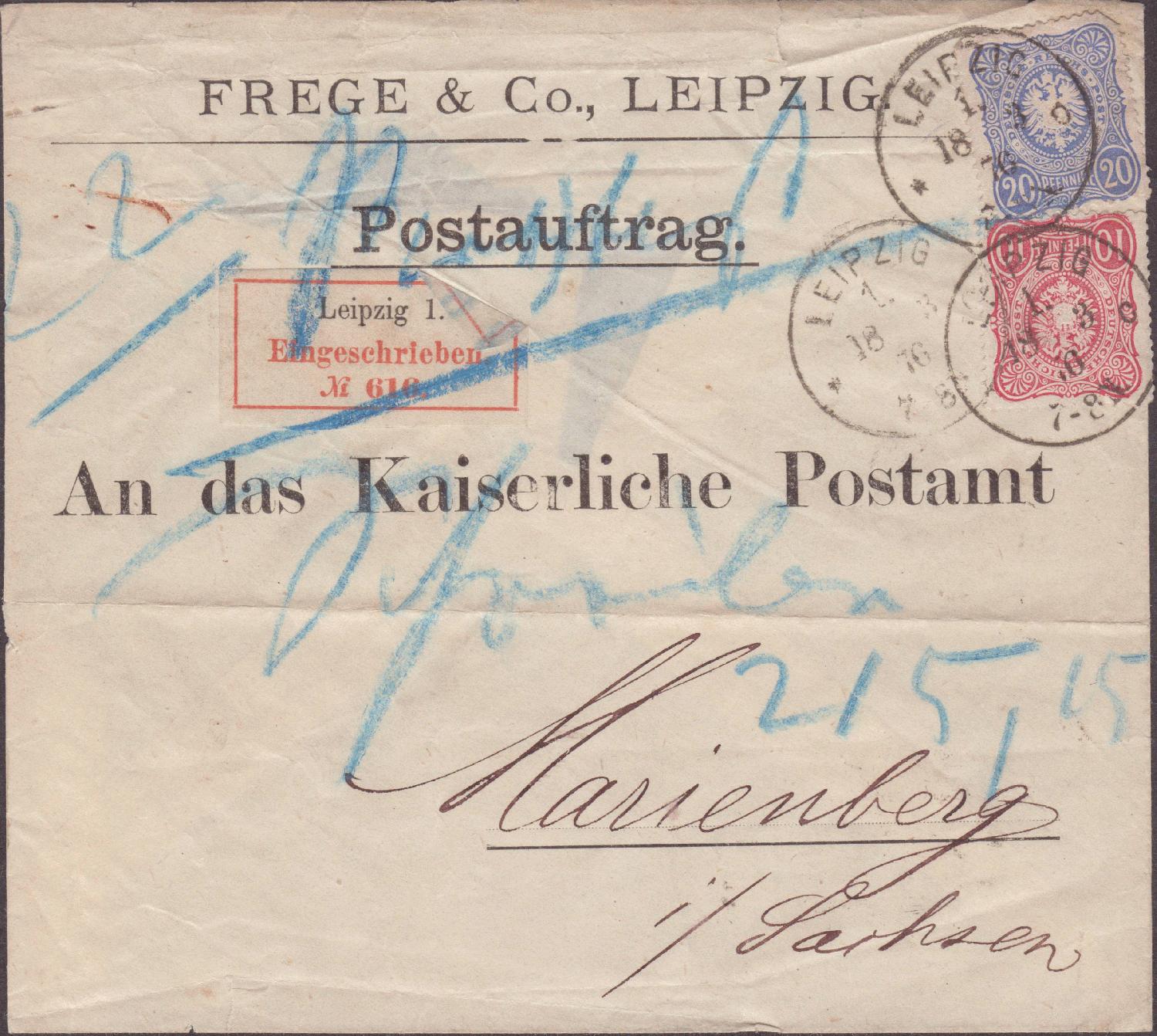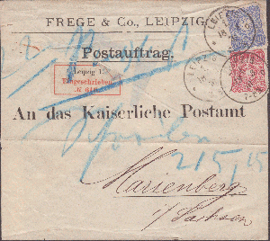 Zu meinen Beleg ist noch sagen, das das Leipziger Bankhaus Frege & Co. im sächsischen Marienberg offene Forderungen hatte und das Postamt in Marienberg entsprechend beauftragte diese einzufordern. Die Gebühr Für den Postauftrag betrug 30 Pfennig. Die Darstellung hier erfolgte mit einer MiNr. 33 und 34. In dieser Zeit waren Forderungsbeträge bis 600,00 Mark zulässig.