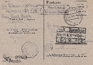 Aufgegeben wurde die Karte dann offenbar in der Poststelle II "Herrlichkeit über Basbeck (Niederelbe)" und erhielt am 05.11.1945 im zugehörigen Leitpostamt den Abgangsstempel BASBECK (NIEDERELBE). Angekommen bei der Stadt Rosenheim ist die Karte dann am 11.11.1945.
