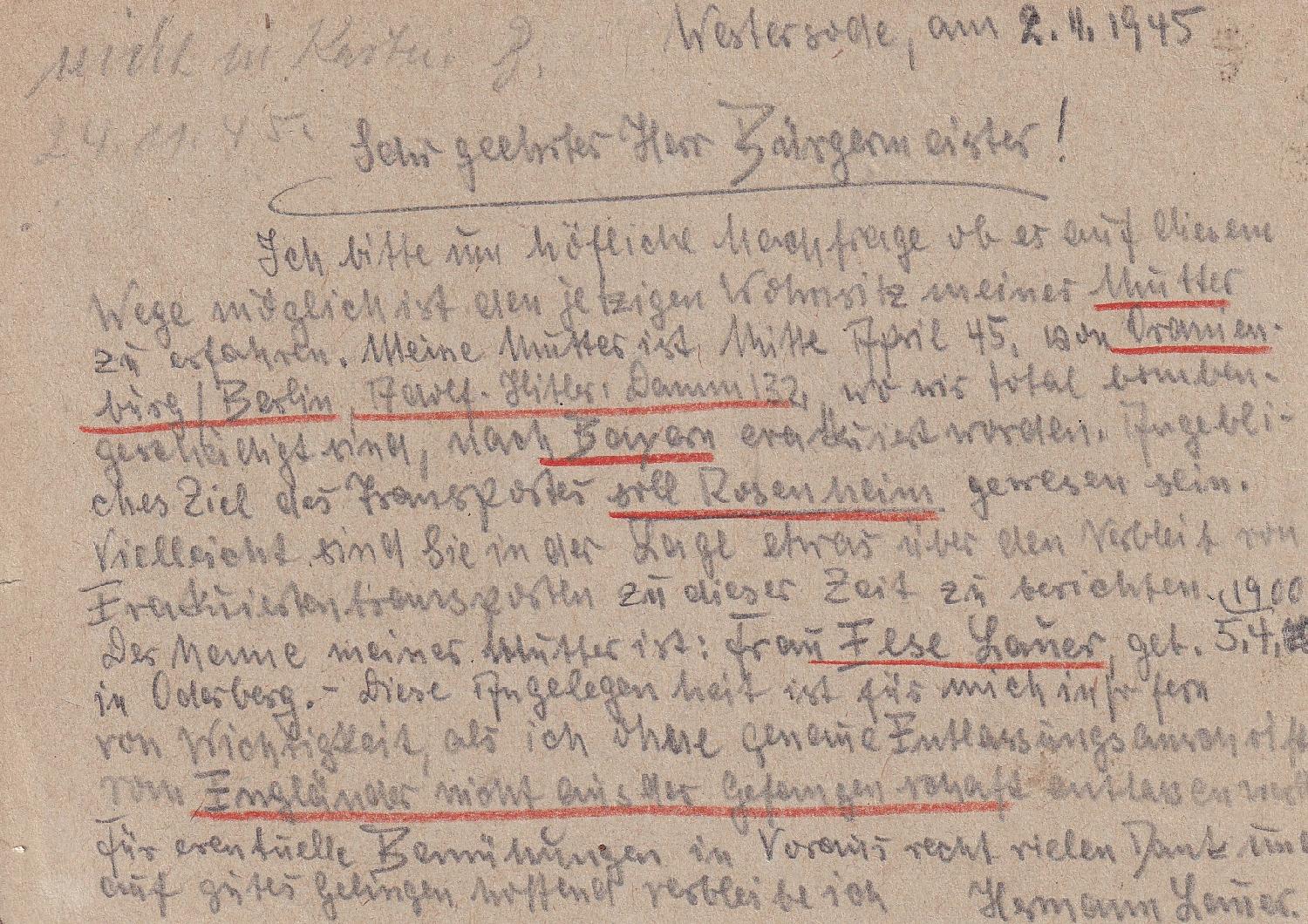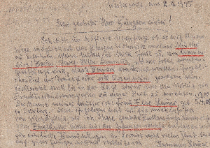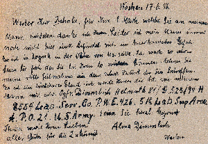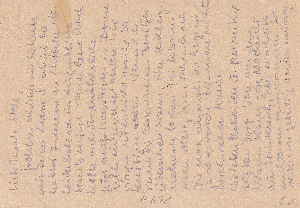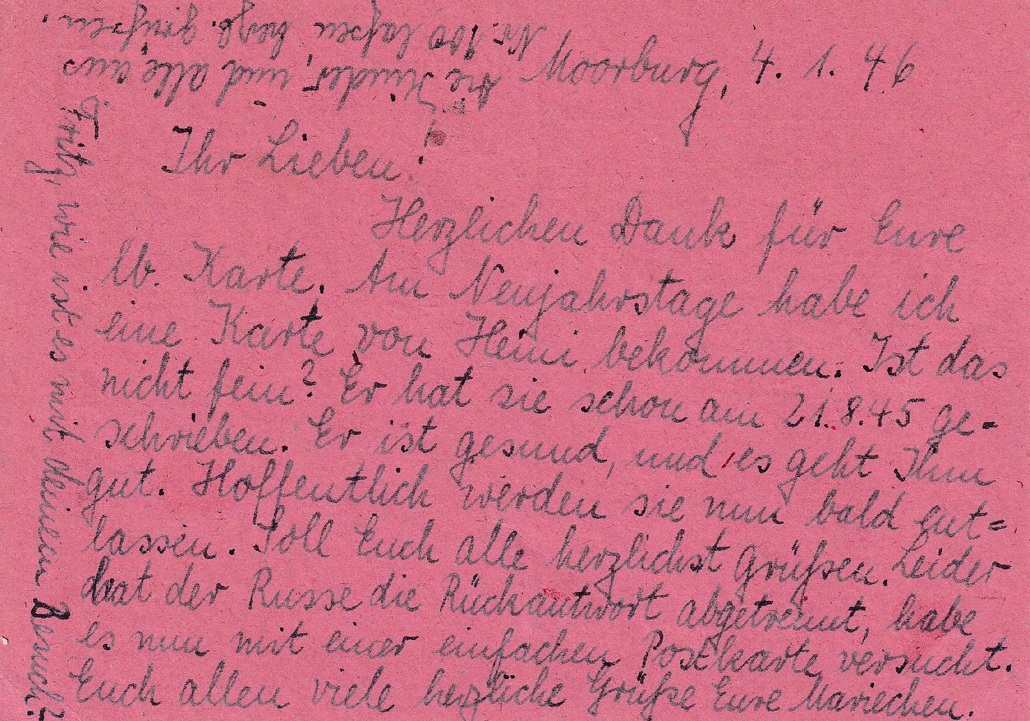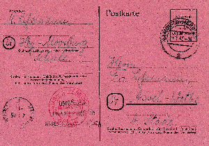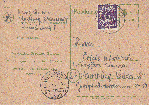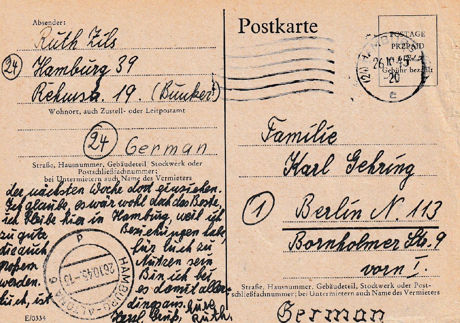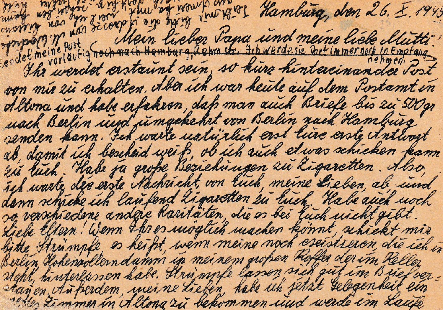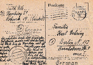 Die Kartenschreiberin berichtet ihren Eltern im zweiten Satz, dass sie dies heute auf dem Postamt in Altona erfahren hat. Auch der weitere Text ist Zeitgeschichte: "und dann schicke ich laufend Zigaretten zu Euch. Habe auch noch so verschiedene andere Raritäten, die es bei Euch nicht gibt....... Ich glaube, es wär wohl doch das Beste, ich bleibe hier in Hamburg, weil ich zu gute Beziehungen habe, die auch für Euch zu großem Nutzen sein werden. Bin ich bei Euch, ist es damit allerdings aus."