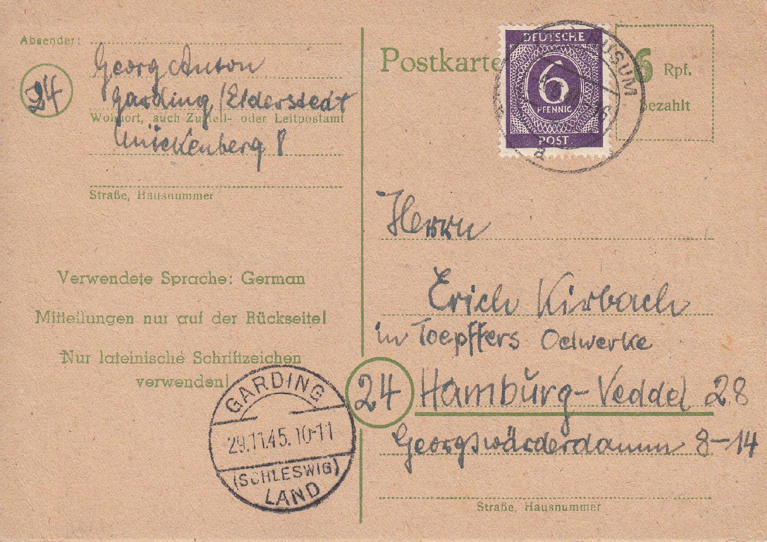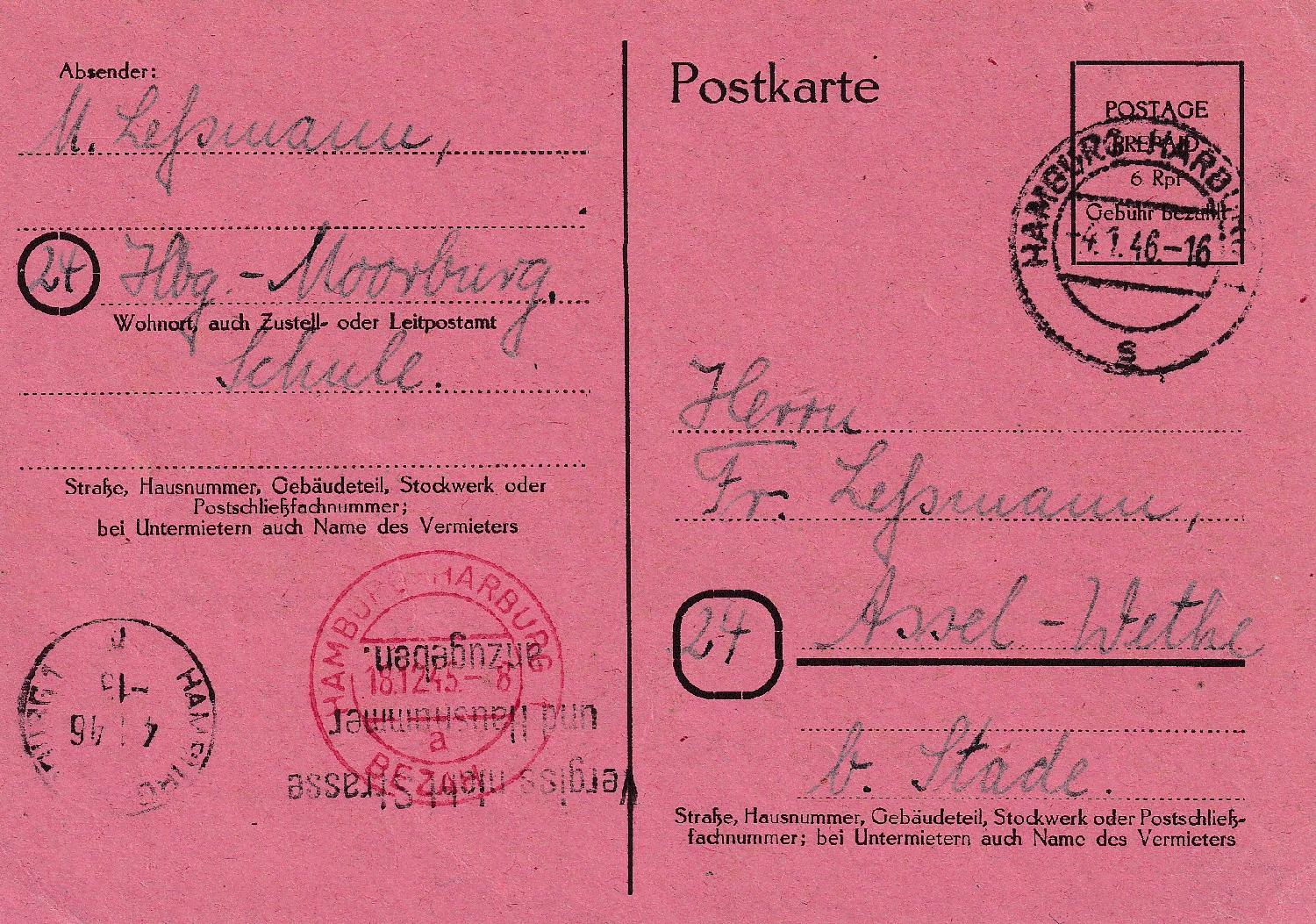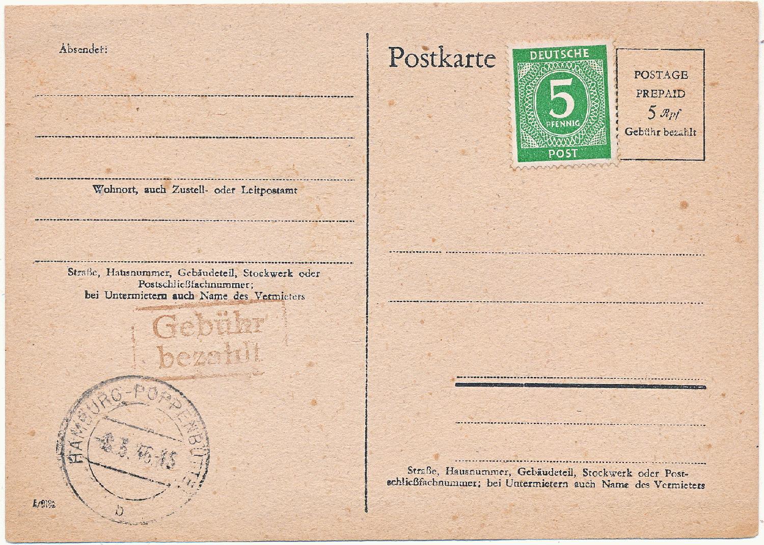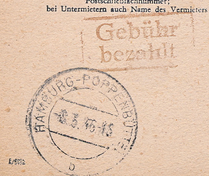 Das ist eine Behelfsausgabe der britischen Zone. Im Michel Ganzsachenkatalog wird der Beleg unter P 705 geführt. Ausgabeorte waren verschiedene Hamburger Stadtgebiete sowie das nahe Umfeld.