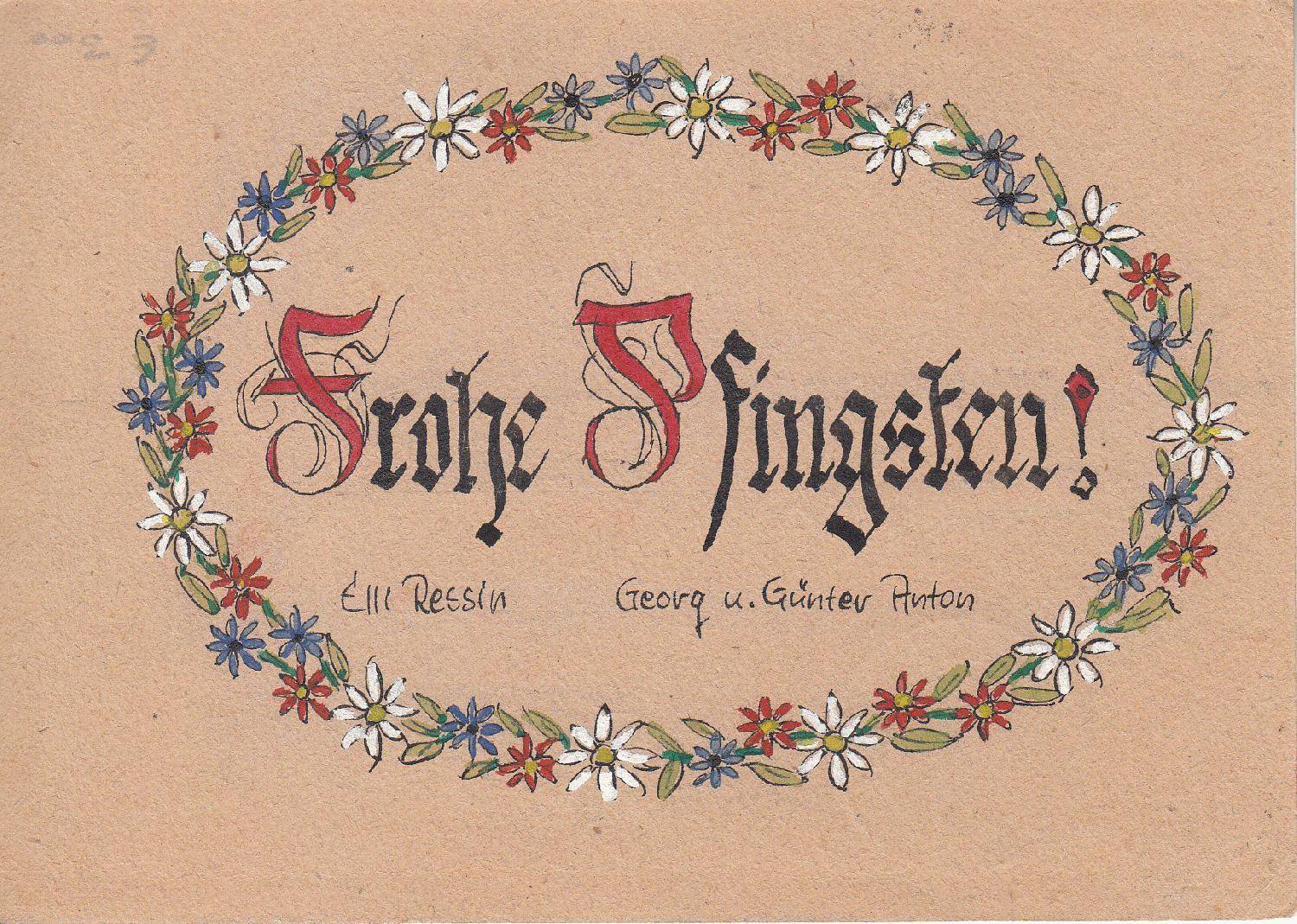 auf der Rückseite einer Behelfsganzsache P 783 I (Ausgabekontrollstempel GARDING LAND (SCHLESWIG) vom 29.11.1945, Abgangsstempel HUSUM erst vom 06.06.1946, daher Auffrankatur) findet sich rückseitig ein farbenfroher Pfingstgruß. Im Bereich der Schrift "Frohe Pfingsten" sind noch Reste von Bleistiftlinien zu erkennen. Deshalb nehme ich an, dass das eine handkolorierte Tuschezeichnung und kein Druck ist. Was für eine akkurate Fleißarbeit!