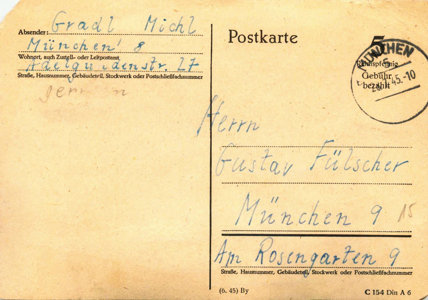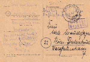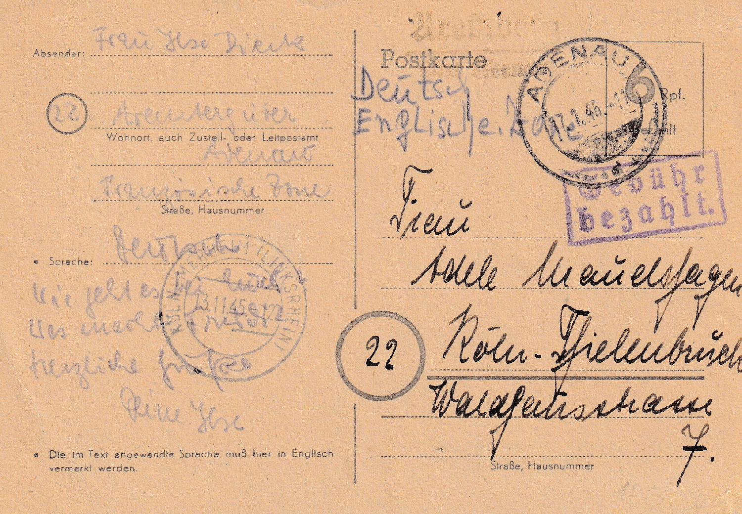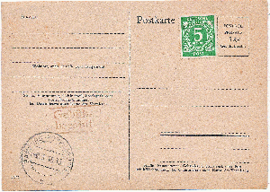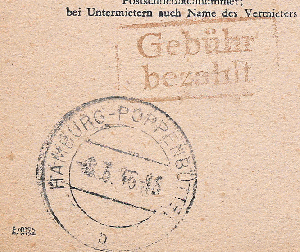 Der Kontrollstempel unten links, mit dem Freivermerk „Gebühr bezahlt“ Stempel bestätigt die Vereinnahmung der Gebühr. Ab dem 1.3.46 betrug das Porto für eine Ortspostkarte 10 Pfg. Das Postamt hat die Belege nach dem 1.3.46 mit einer zusätzlichen Freimarke zu 5 Pfg. dann herausgegeben. Als Fernpostkarte wären es 12 Pfg gewesen.