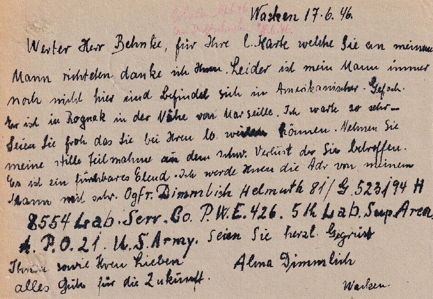 Daher zeige ich das Teil hier. Datum undeutlich aber zumindest Monat und Jahr (x.6.1946) sind etwas lesbar. Ob die Ganzsache hierher gehört, entzieht sich meiner Kenntnis.