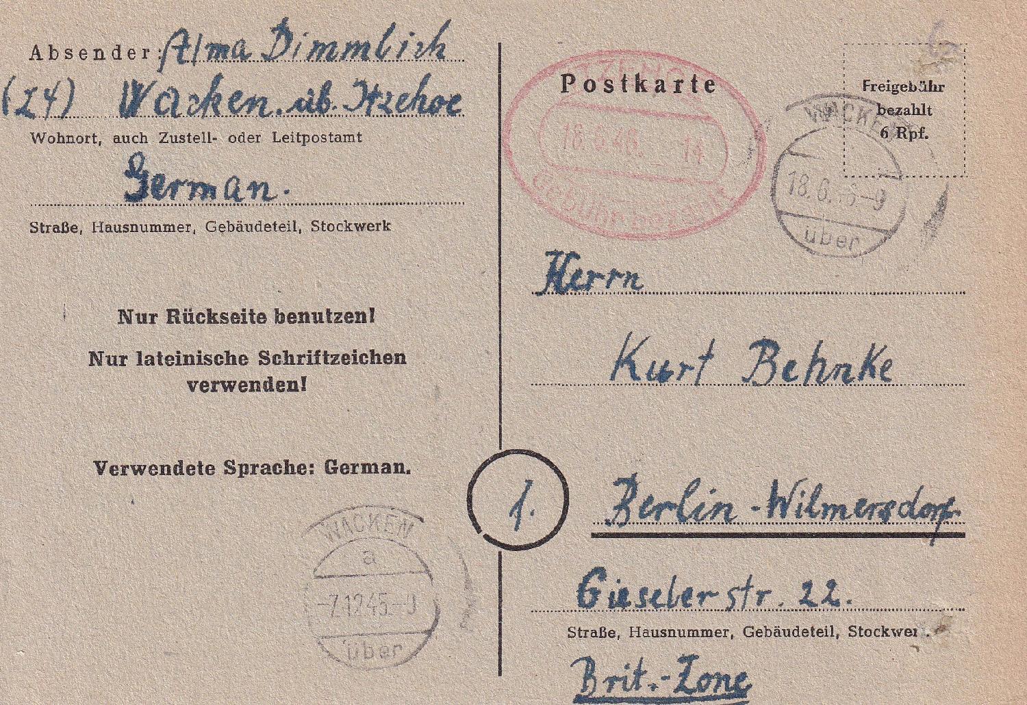 Nun zurück zur vorliegenden Karte. Gekauft wurde die Karte bereits am 07.12.1945 in Wacken (Ausgabekontrollstempel links unten). Geschrieben wurde die Karte aber erst Monate später am 17.06.1946. Der Abgangsstempel datiert vom 18.06.1946. Zwischenzeitlich war am 01.03.1946 eine Portoverdoppelung eingetreten. Die Karte wurde daher mit einem Freivermerk - hier ein ovaler Paketstempel mit integriertem "Gebühr bezahlt" - aufgewertet. Dieser Stempel ist aber aus ITZEHOE und datiert ebenfalls vom 18.06.1946. Wie passt das zusammen?