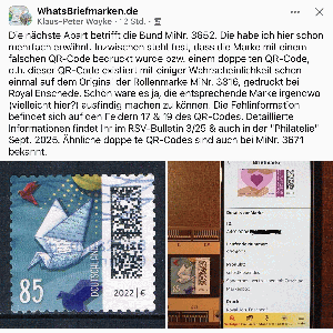 auf der Briefmarkenmesse in Ulm kam am RSV-Stand ein weiterer Sammler mit möglichen betroffenen Marken mit doppelten Matrixcode aus der Produktion aus Holland vorbei und bei einigen dieser Marken konnte mittels der Post + DHL App eindeutig nachgewiesen werden, das die gleichen Marken mit dem identischen Matrixcode schon vor längerer Zeit auf einem Einschreiben benutzt worden sind.