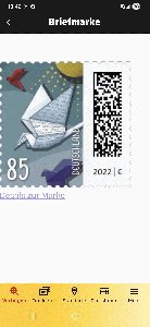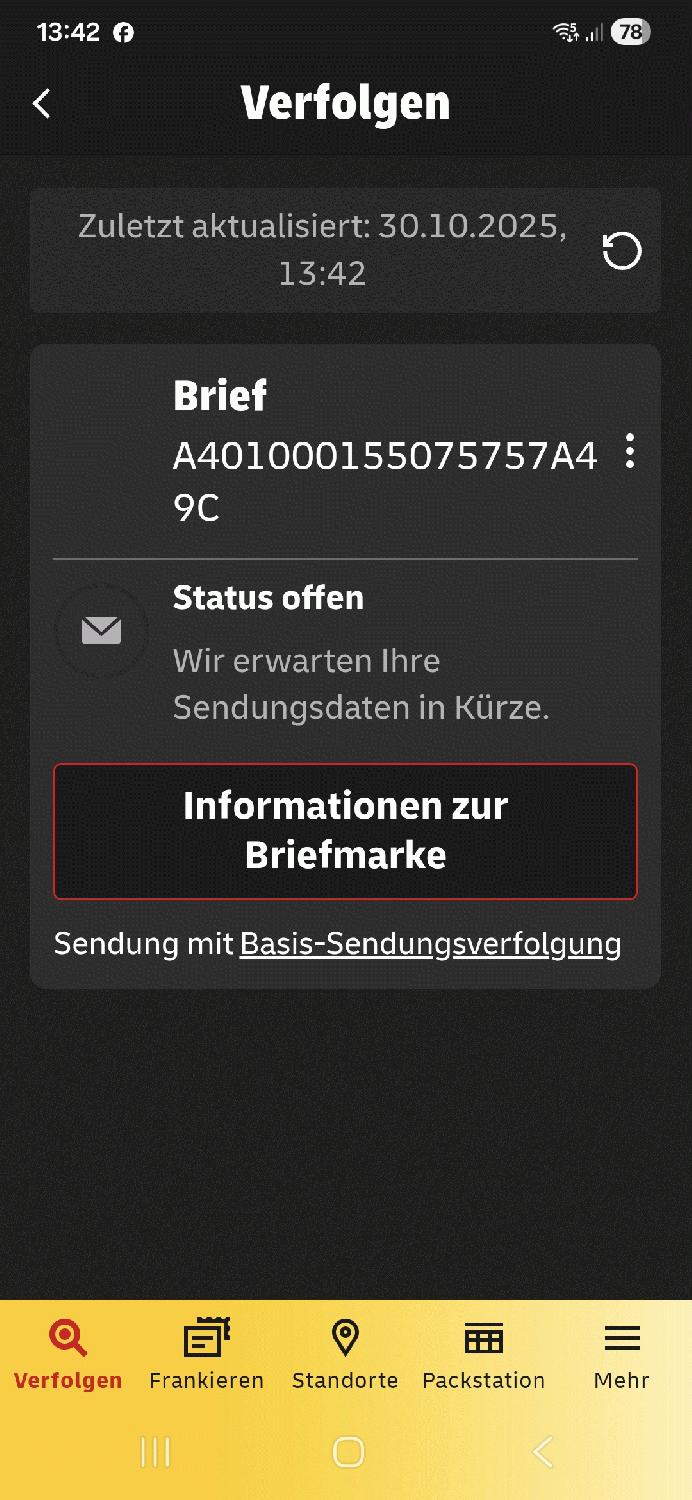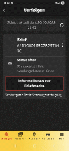 ja ich hatte weiter oben doch einen kleinen Zwischenschritt übersehen, wenn man den Matrixcode scannt, erscheint, so wie Du das richtig zeigst in der ersten Maske der schwarze Schirm mit der Schaltfläche "Informationen zur Briefmarke", diesen muss man nun als nächstes drücken,