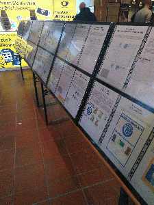 Am Rande bemerkt: die Gelsenkirchner Briefmarkenfreunde hatten keine Ausstellungsrahmenrahmen, sondern hatten die Albenblätter auf einem selbstgebauten Ständer ähnlich einer Staffel befestigt und das Ganze auf Biertische gestellt. Für eine kleine Vereinsaustellung reicht das vollkommen aus und niemand muss Rahmen schleppen. Ich denke, dass die Gelsenkirchner Briefmarkenfreunde die Baupläne herausrücken, die benötigten Pressspanplatten gibt es auf dem Sperrmüll sogar umsonst.
