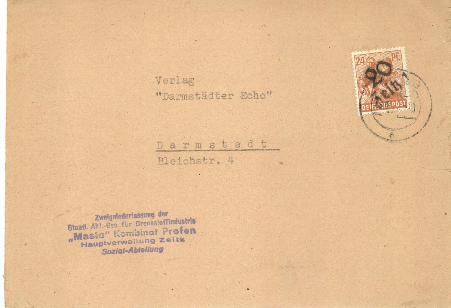 ich habe folgenden Beleg mit einer Briefmarke mit dem Aufdruck " 20 Zeitz" gefunden.