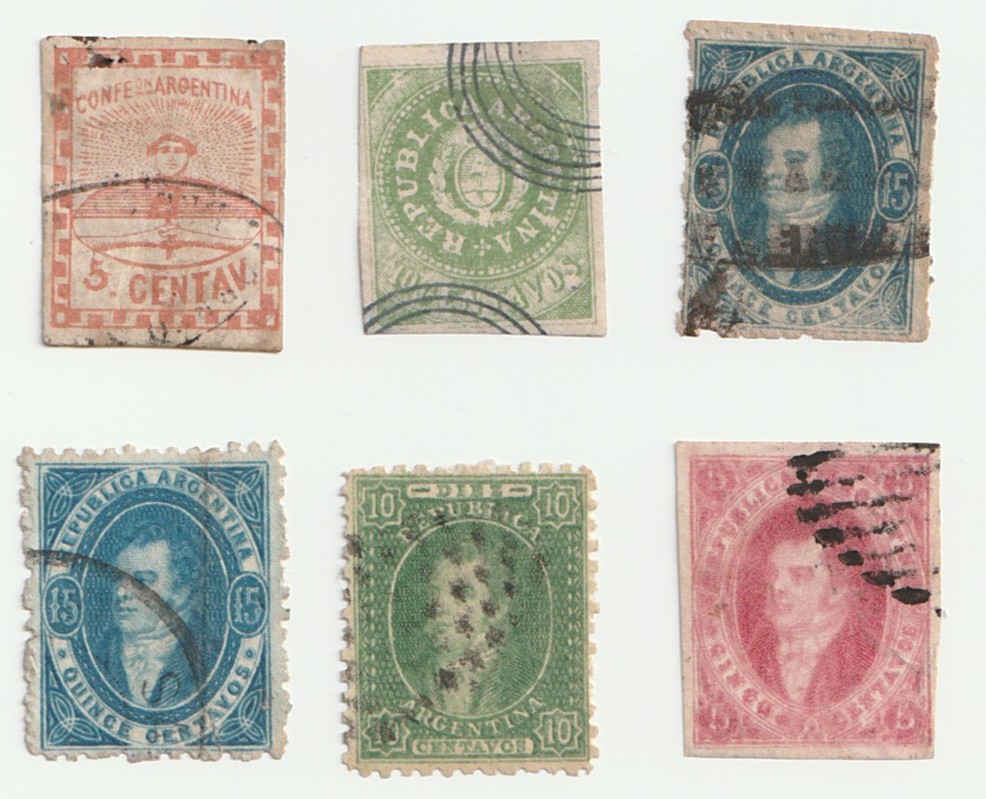 -10c grün MiNr.6 (Fälschungen extrem häufig, das gezeigte Stück ist höchstwahrscheinlich falsch, es hat schon auf den ersten Blick einen sehr verdächtigen Stempel, Position der Buchstaben der Inschrift "Republica Argentina" in Bezug zur Inschrift "Centavos" weicht deutlich ab (unten in den Links sind aktuelle Vergleichsstücke bei Philasearch))