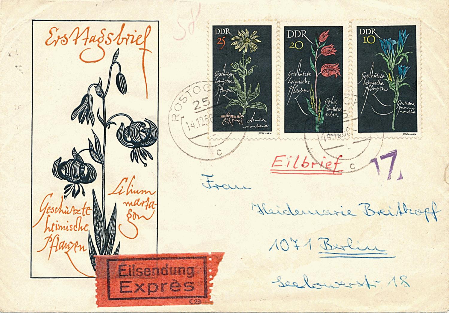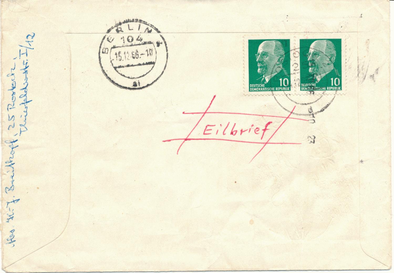 Den blauen Zusatzstempel 1Z fand ich auf einem Eilbrief vom 14.12.1966 aus Rostock nach Westberlin. Liege ich richtig, dass es sich um einen postinternen Stempel der Westberliner Post handelt und die 1. Zustellung dokumentiert? (rückseitig weitere 20 Pf. für Gesamtporto 75 Pf. frankiert)