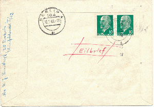 der Brief ist etwas überfrankiert (5 Pf) und gelangte wohl in einem Eilbeutel per Bahnpost nach Berlin. Beim Postamt Berlin 4 (bis zur PLZ-Einführung "N4") wurde der Brief bis 10Uhr bearbeitet und dann wohl per Rohrpost (über das Haupttelegraphenamt) nach Berlin 71 (bis zur PLZ-Einführung "N 113") weiter geleitet. Rechts befindet sich ein Zeitstempel mit Datum und Uhrzeit - dies ist wohl der Eingangsstempel von Berlin 71.