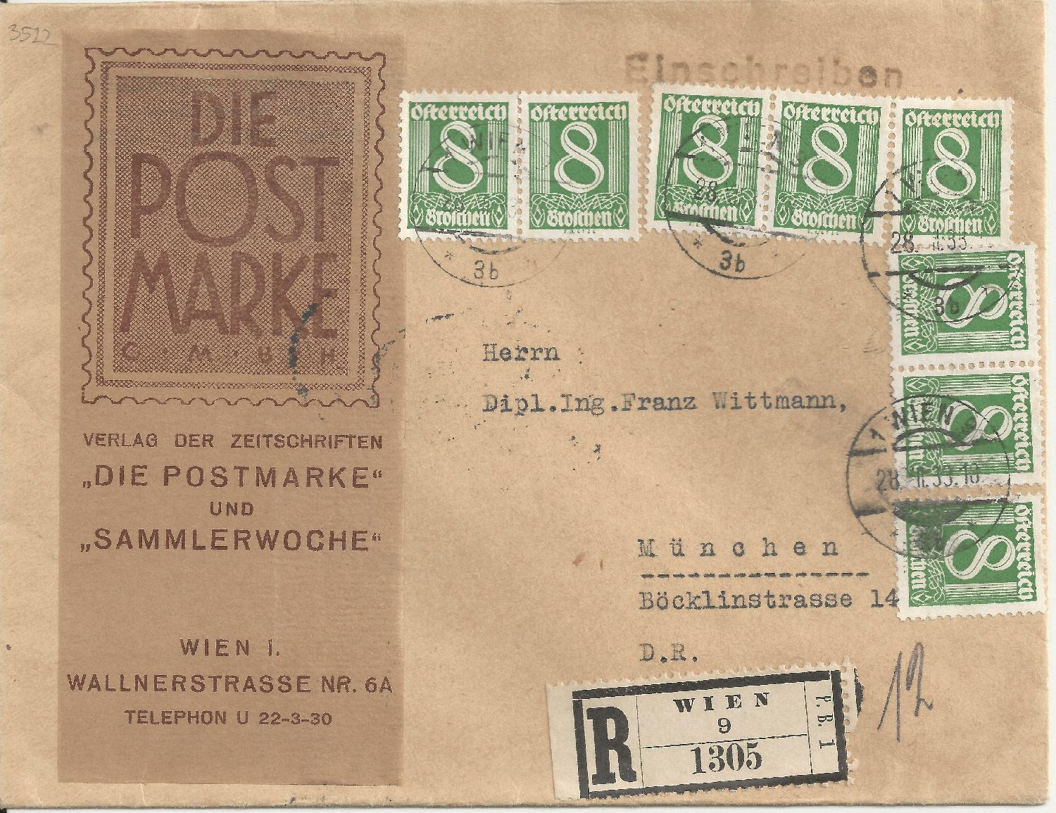 Rekobrief vom 28.2.1933 von Wien nach München. Brief 24 Groschen Einschreiben 40 Groschen.