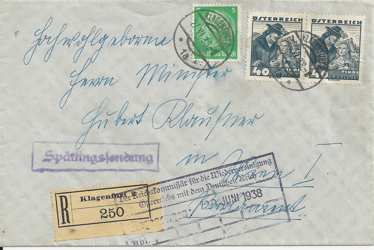 Eingeschriebene Spätlingssendung vom 27.6.38 von Klagenfurt nach Wien.
