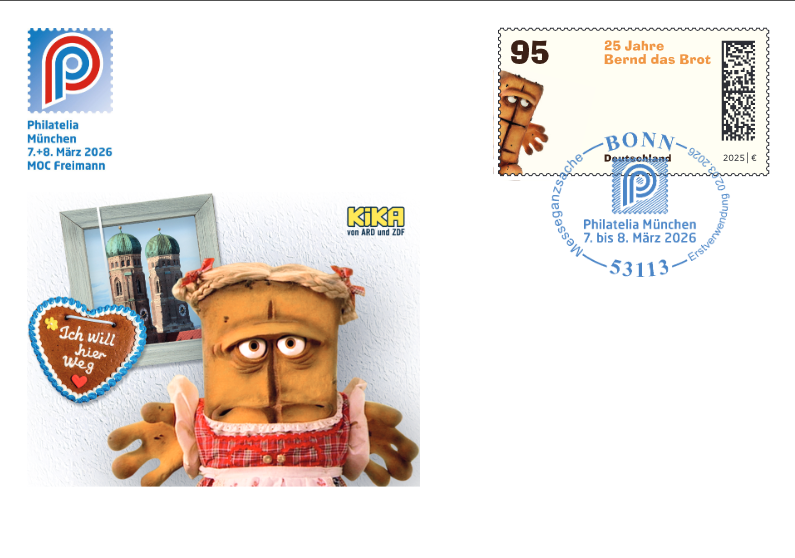 Am 4. September 2025 erschien eine Marke zu 95 Cent mit dem Thema „25 Jahre Bernd das Brot“, welche den beliebten Fernsehhelden würdigt. Die Idee für „Bernd das Brot“ wurde in München geboren und daher gehört Bernd ausnahmsweise nicht ins Weltall, sondern auf die Messeganzsache. In der für ihn typischen Art kann Bernd aber leider nicht so recht die Freuden des Oktoberfestes geniessen, obwohl er hierzu passend gekleidet ist.