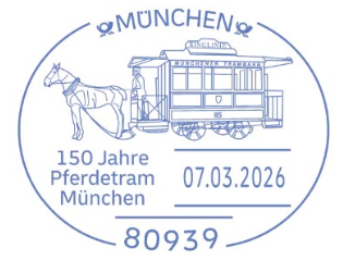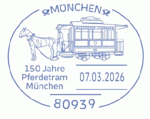 Die Münchner Philatelistenvereine gedenken der ersten Pferdetrambahn in München. Vor 150 Jahren fuhr die erste Pferdebahn vom Promenadeplatz zur Nymphenburger – / Maillingerstraße und markierte den Beginn des öffentlichen Nahverkehrs in München. Von 1895 an fuhren die ersten elektrischen Straßenbahnen, 1900 verschwanden die Pferdebahnen aus dem Stadtbild.