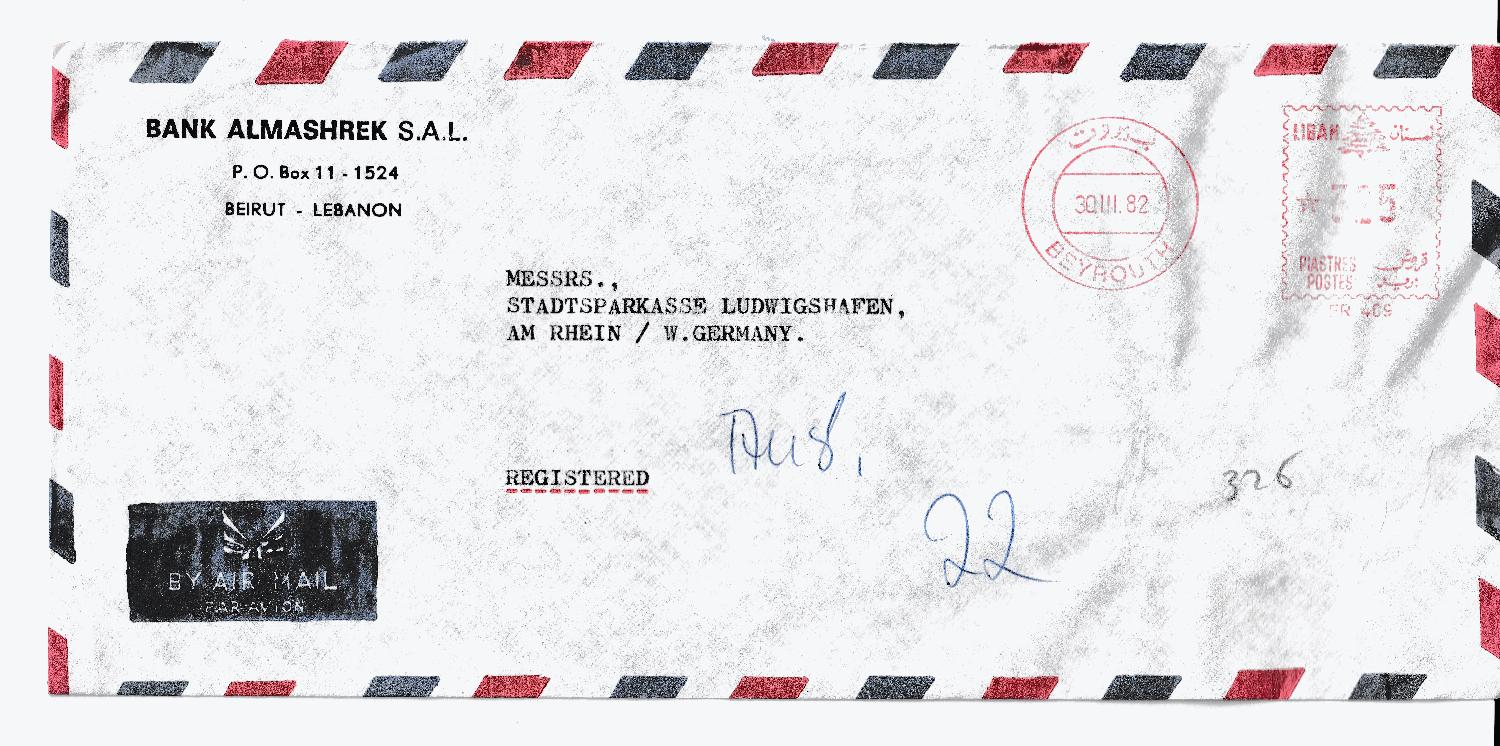 Brief der Bank Almashrek S.A.L Beirut Libanon an die Stadtsparkasse Ludwigshafen vom 30.III.82 mit Freisstempel: