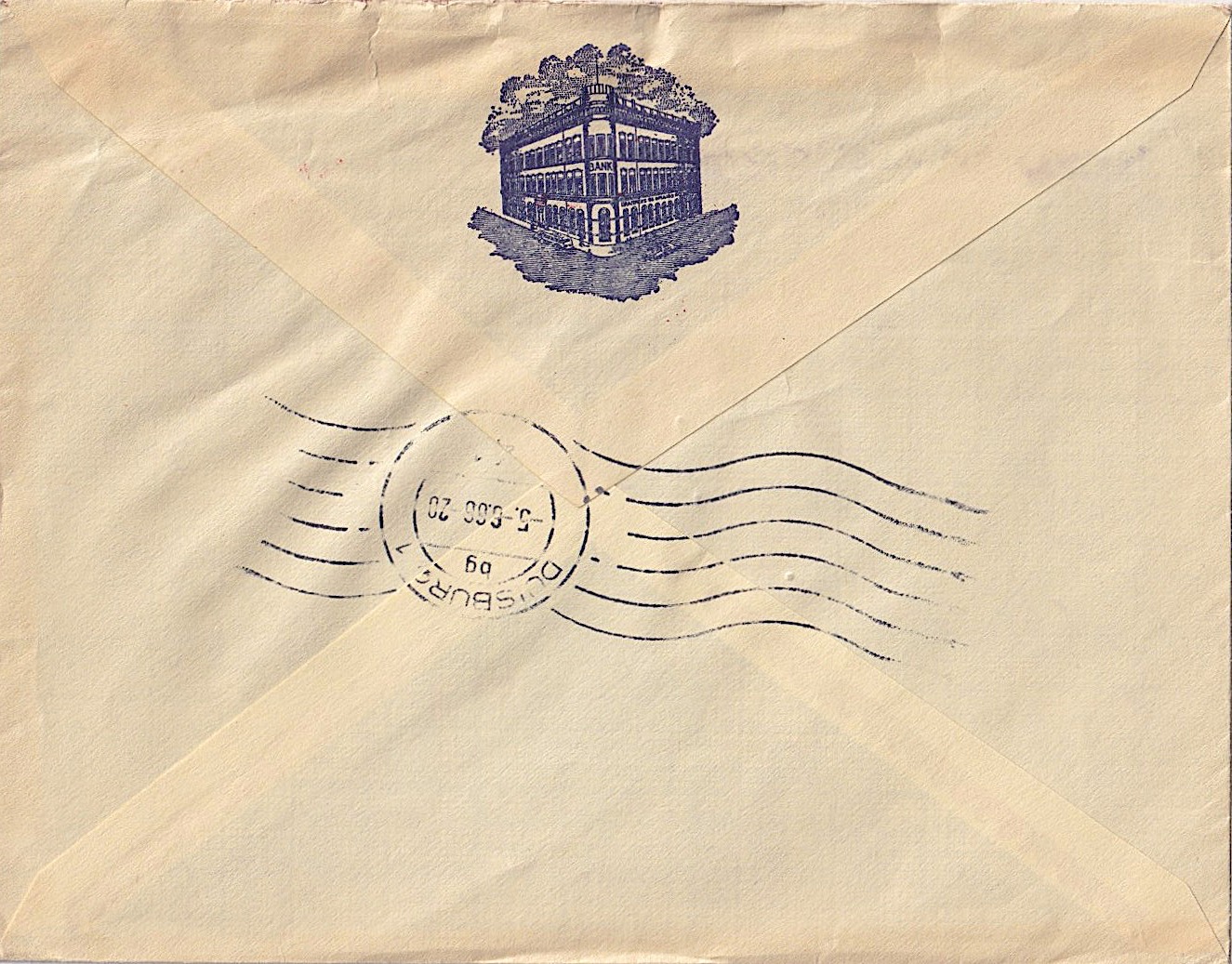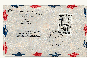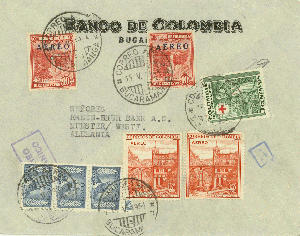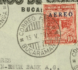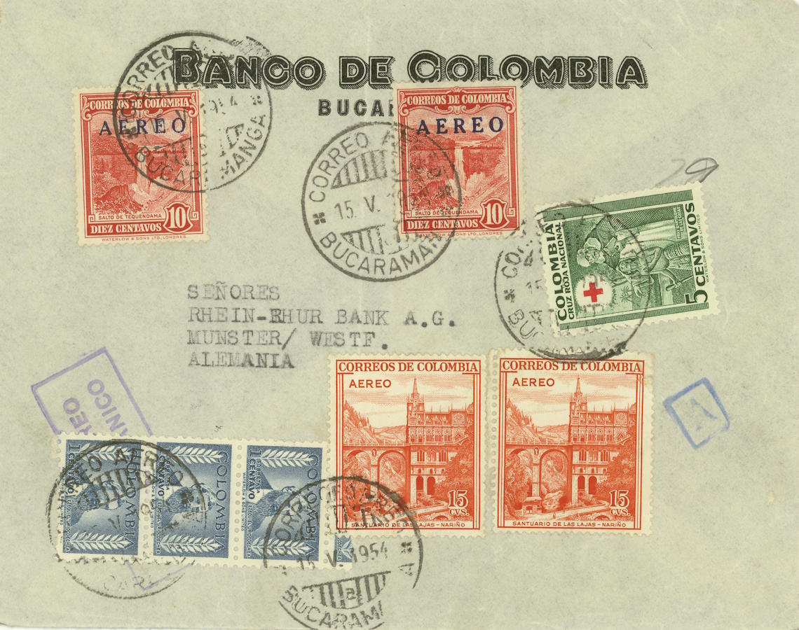 Heute ein Brief der BANCO DE COLOMBIA, gelaufen am 15.5.1954 von Bucaramanga [1] an die Rhein-Ruhr-Bank A.G. in Münster. Rückseitig wurde ebenfalls Frankatur aufgeklebt, aber eine Marke fehlt.