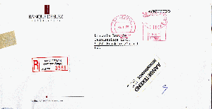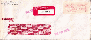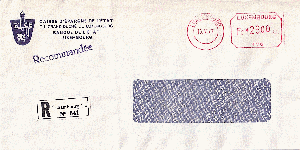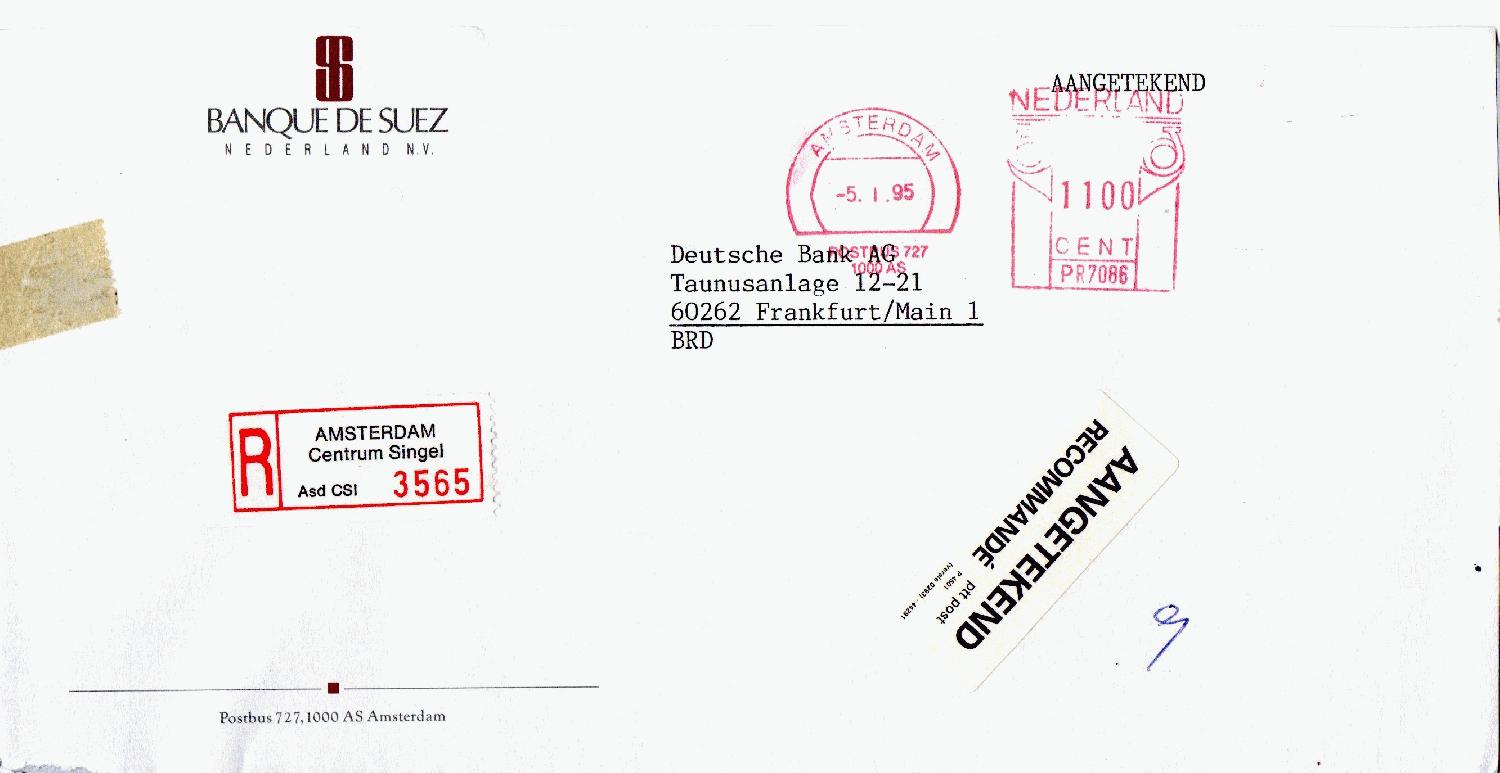 R-Brief vom 05.01.1995 von der Banque De Suez Nederland an die Deutsche Bank Frankfurt., frankiert mit Absenderfreistempel 1100 Cent.