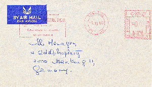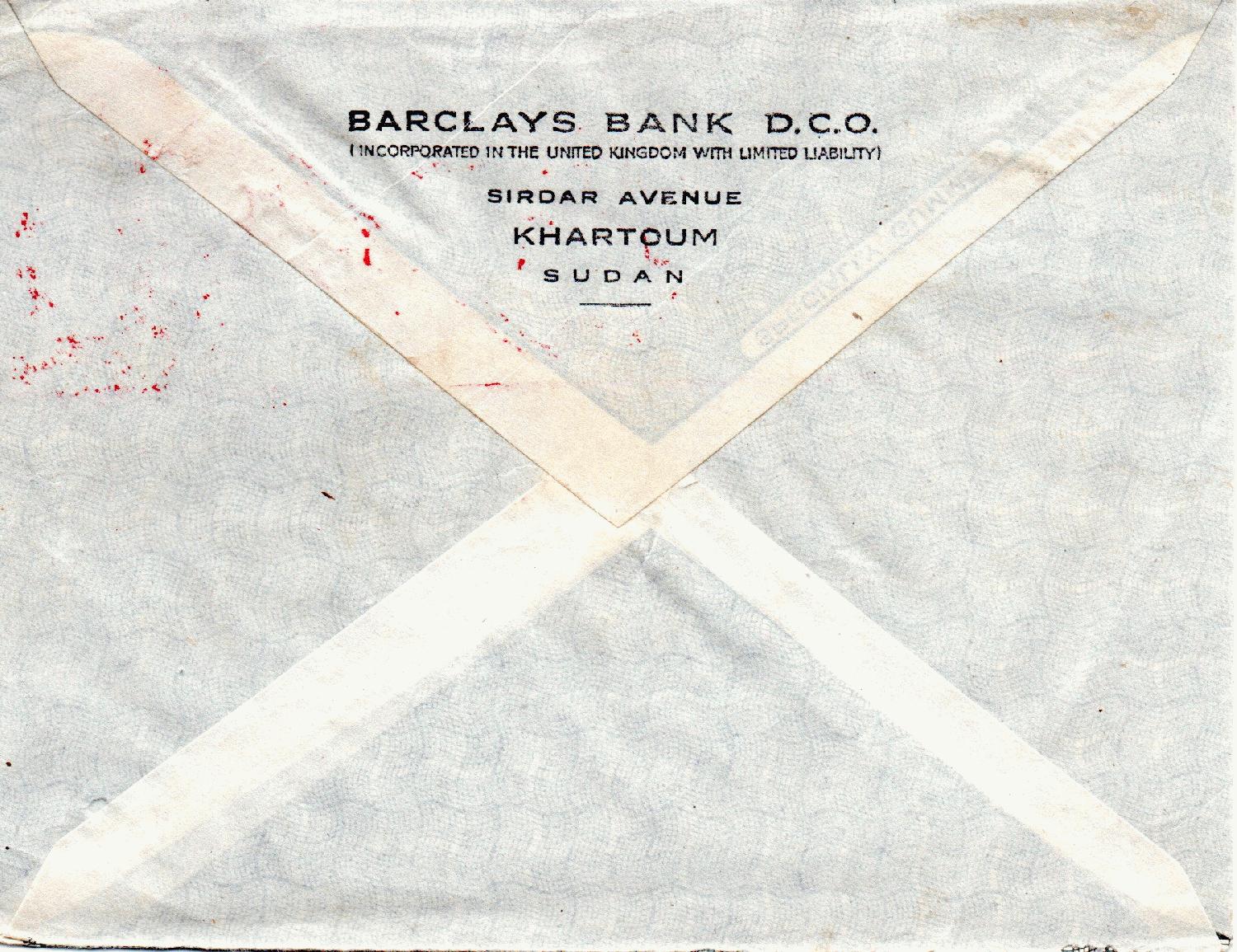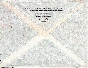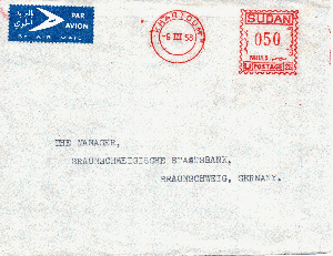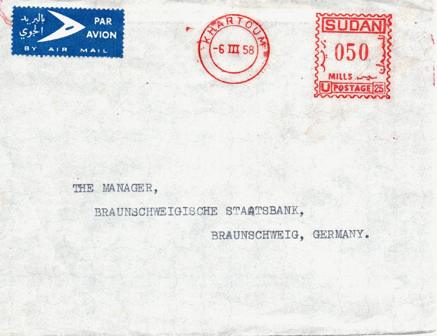 Von der Barclays Bank wurden schon verschiedene Belege gezeigt nicht aber dieser aus dem Sudan. Luftpostbrief vom 06.03.1958 von Khartoum an die Braunschweigische Staatsbank, frankiert mit Freistempel 50 Mills.