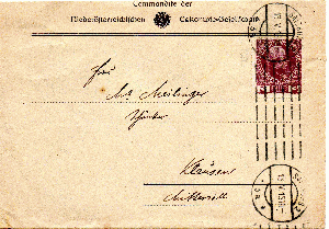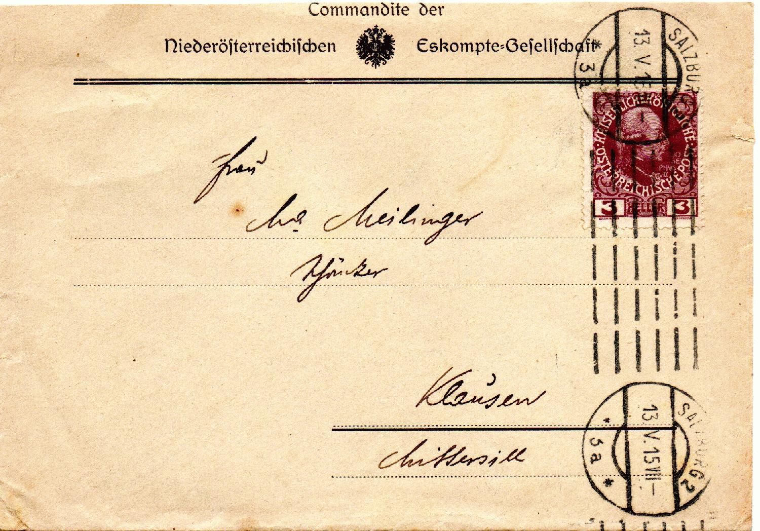 Drucksache vom 13.06.1915 von der Niederösterreichischen Eskompte-Gesellschaft in Salzburg nach Klausen bei Mittersill, frankiert mit Michel Nr. 141, 3 Heller.