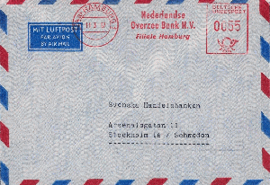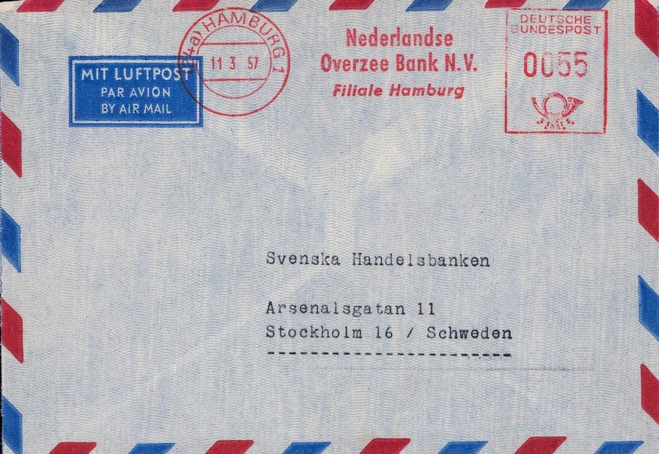 Die Hambuger Filiale der "Nederlandse Oversee Bank" versandte im März 1957 diesen Brief in Richtung Schweden, die Gebühr (40+15) entrichtet mit einem Absenderfreistempel E-23.