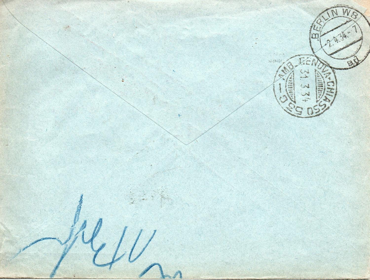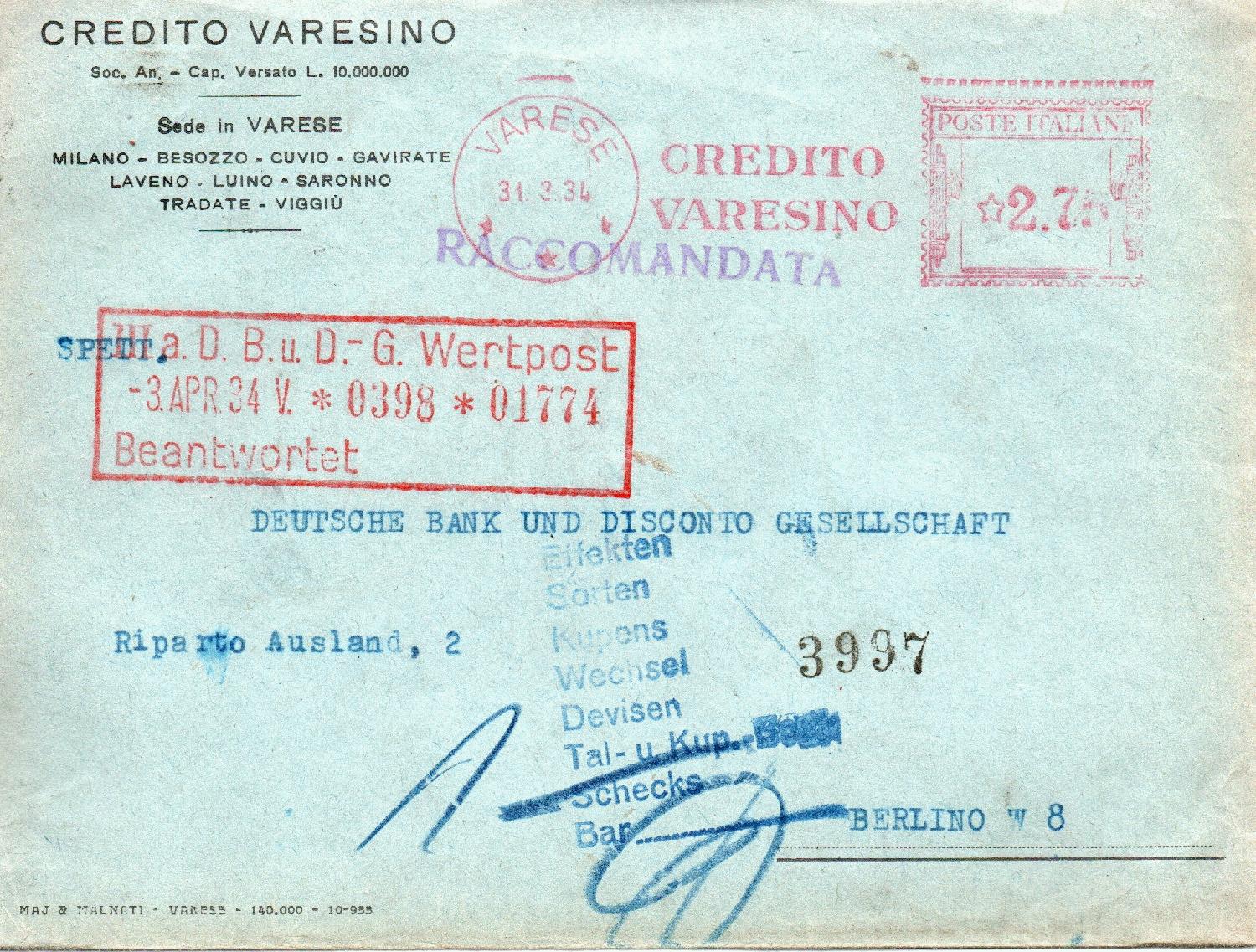 hier ein Einschreiben der Credito Varesino aus Varese an die Deutsche Bank in Berlin. AFS 31.3.34. Eingangsstempel „Berlin W8, 2.4.34. Zusätzlich trägt der Brief einen Zählstempel der offensichtlich von dem Berliner Postamt zur Zählung eingegangener Auslandswertbriefe gesetzt wurde.