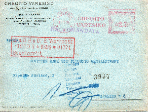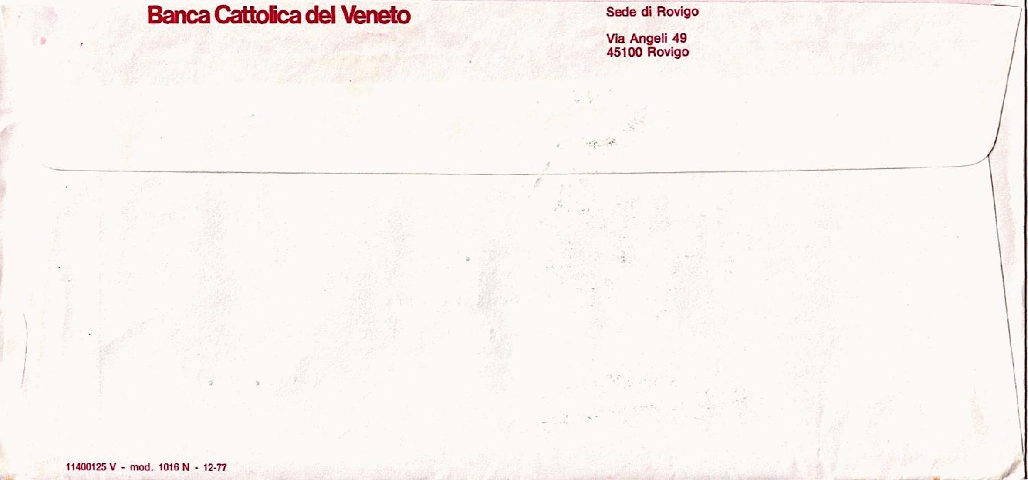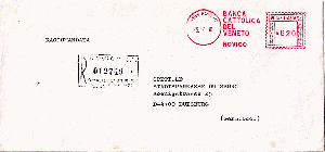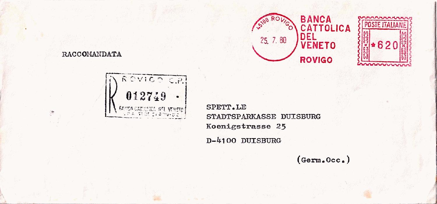 vom 25.7.1980 liegt mir aus 45100 ROVIGO dieses Einschreiben mit dem AFS "BANCA / CATTOLICA / DEL / VENETO / ROVIGO" [1] an die Stadtsparkasse in D-4100 Duisburg vor.