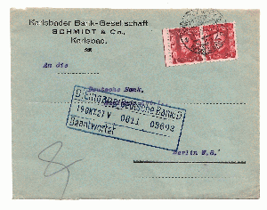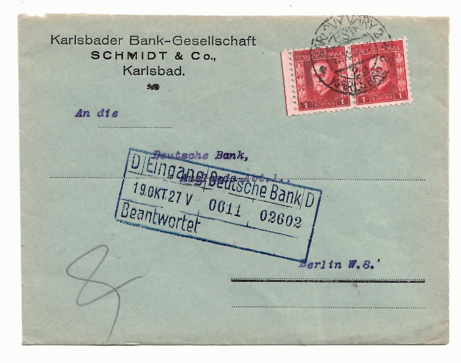 Weltweit fand ich keinerlei Hinweise zu der Karlsbader Bank-Gesellschaft Schmidt & Co., es muss eine sehr kleine unbedeutende Bank gewesen sein, hier allerdings auf einem schönen Beleg mit einem waagrechten Paar vom linken Bogenrand von Präsident Masaryk, gelaufen am 28.10.27 von Karlsbad nach Berlin.