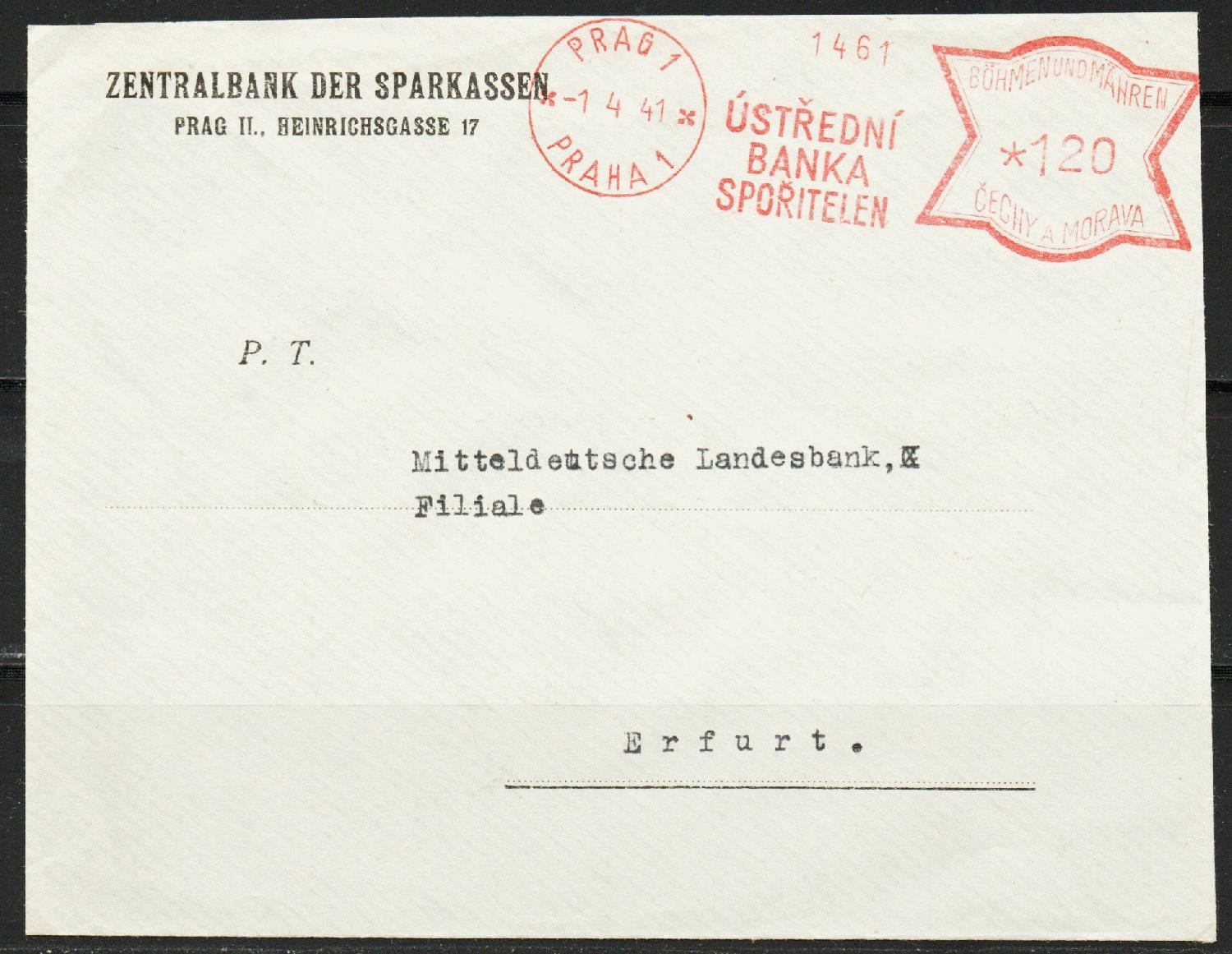 Brief vom 01.04.1941 aus Prag 1 an die Mitteldeutsche Landesbank, Filiale Erfurt.