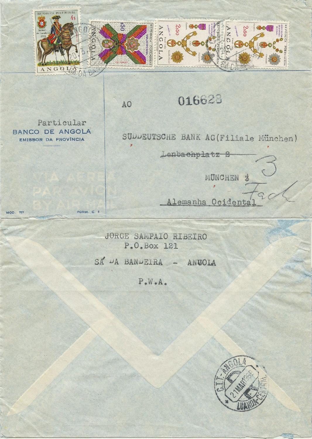 Ein Brief der Bank von Angola (Landesemittent) nach München an die Süddeutsche Bank AG, also dem Vorläufer der Deutschen Bank.