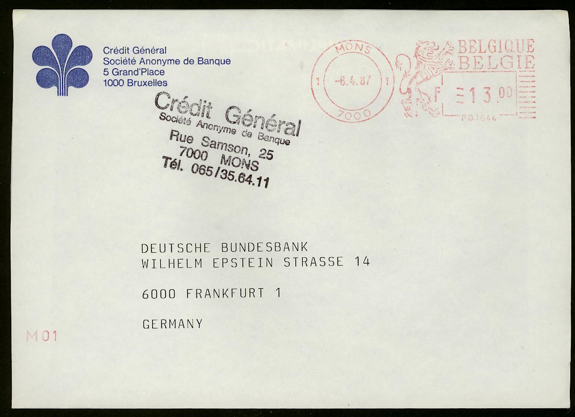 Die Crédit Générale von Belgien schickte am 6.4.1987 von ihrer Zweigstelle in Mons einen Brief an die Deutsche Bundesbank in Frankfurt. Informationen zur Bank habe ich nicht finden können; vom Namen her denke ich, dass es die belgische Staatsbank ist.