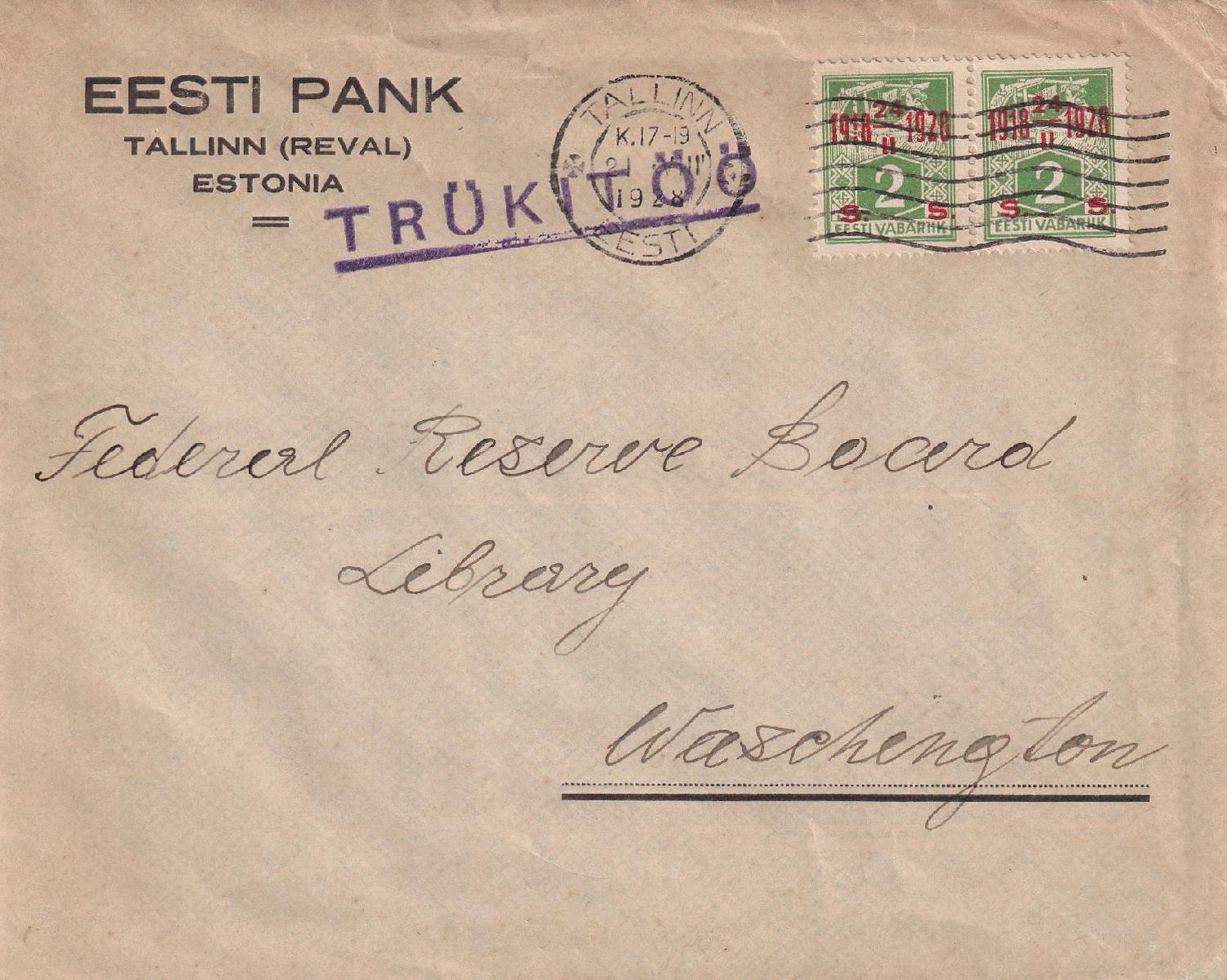 einer als Drucksache frankiert von Tallinn nach Washington / USA 31.08.1928
