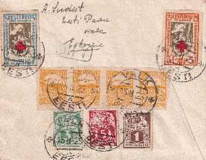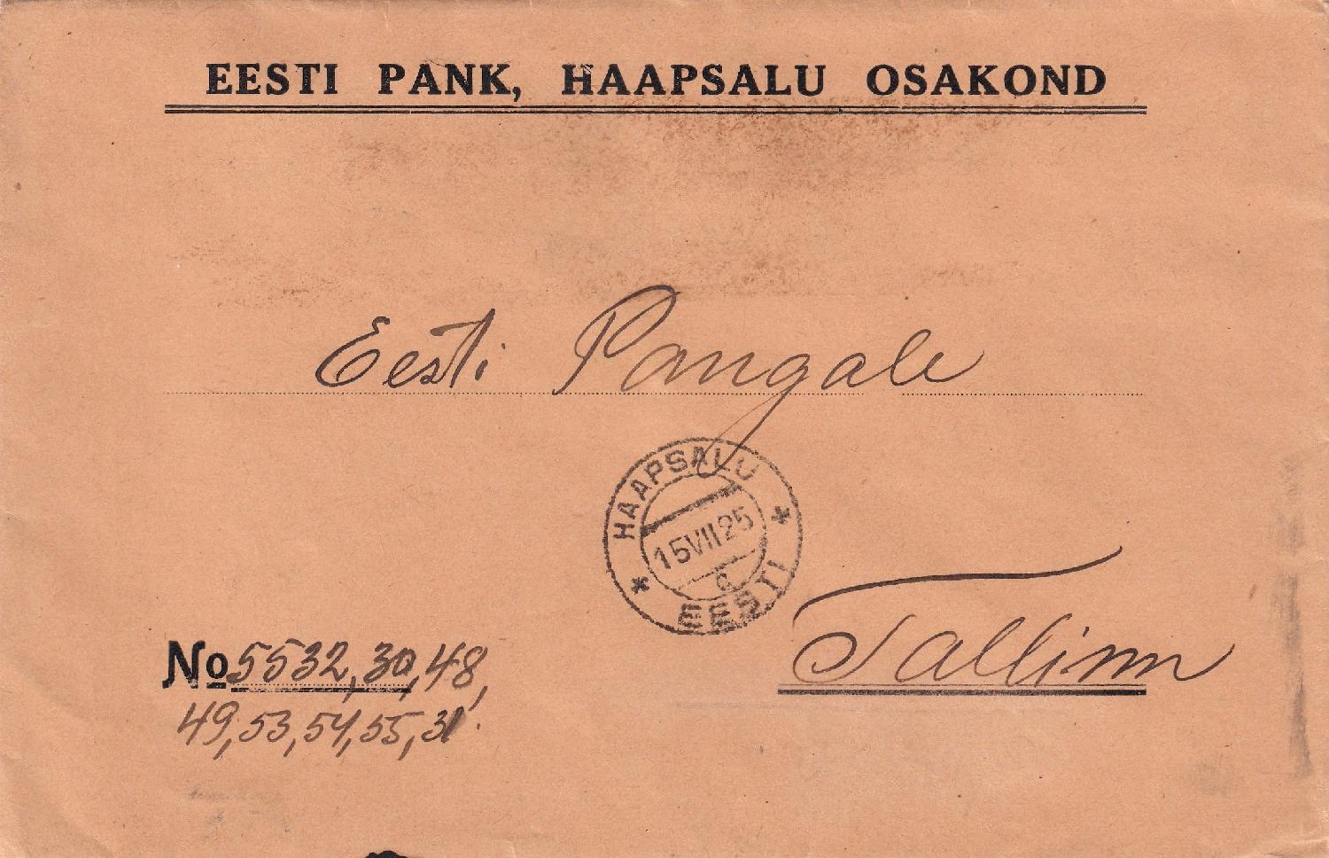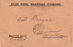 Im Inland wurde nicht jeder Brief einzeln frankiert, sondern die Briefe in Listen eingetragen und monatlich abgerechnet (das System war von der russischen Post 1918 so übernommen worden). Die Listennummern sind links unten in einem Eindruck handschriftlich oder mit Paginierstempel eingetragen.
