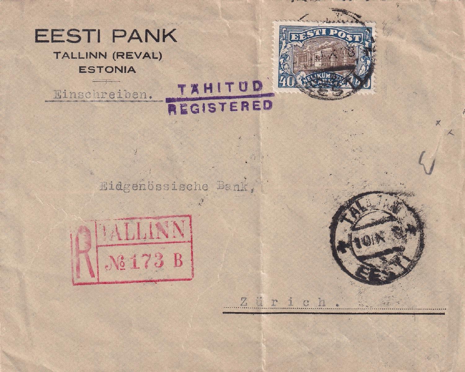oder dieser als Einschreiben von Tallinn nach Zürich / Schweiz 10.09.1928