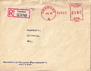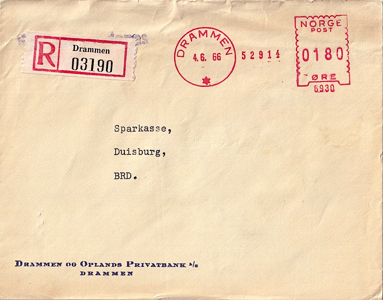 ein Einschreiben der Drammen og Oplands Privatbank A/S aus Drammen in Norwegen vom 4.6.1966 an die Sparkasse in Duisburg. Der Frama-Stempel weist die Maschinennummer 6930 aus. Rückseitig wird einmal das Bankgebäude dargestellt und zudem die Auslieferung mit Handrollstempel DUISBURG 1 / bg / 41 vom 5.6.1966 dokumentiert.