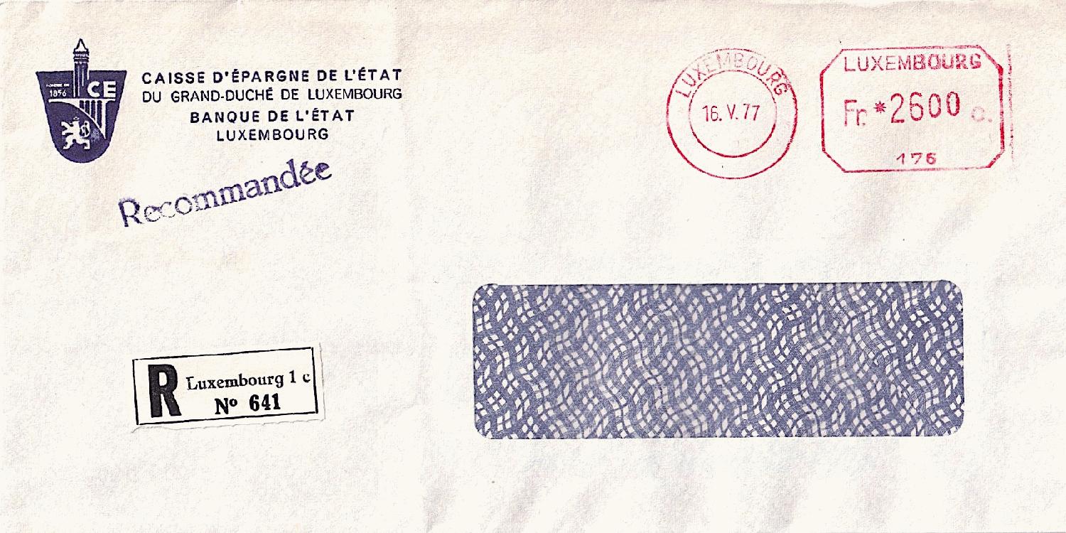 ein Einschreiben vom 16.5.1977 aus LUXEMBOURG von der "CAISSE D'ÉPARGNE DE L'ÉTAT DU GRAND-DUCHÉ DE LUXEMBOURG / BANQUE DE L'ÉTAT LUXEMBOURG". Das Signet der Bank im Briefumschlag weist das Jahr der Gründung mit 1856 aus.