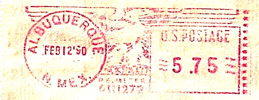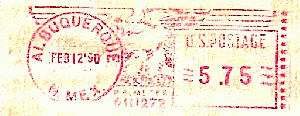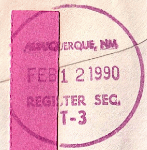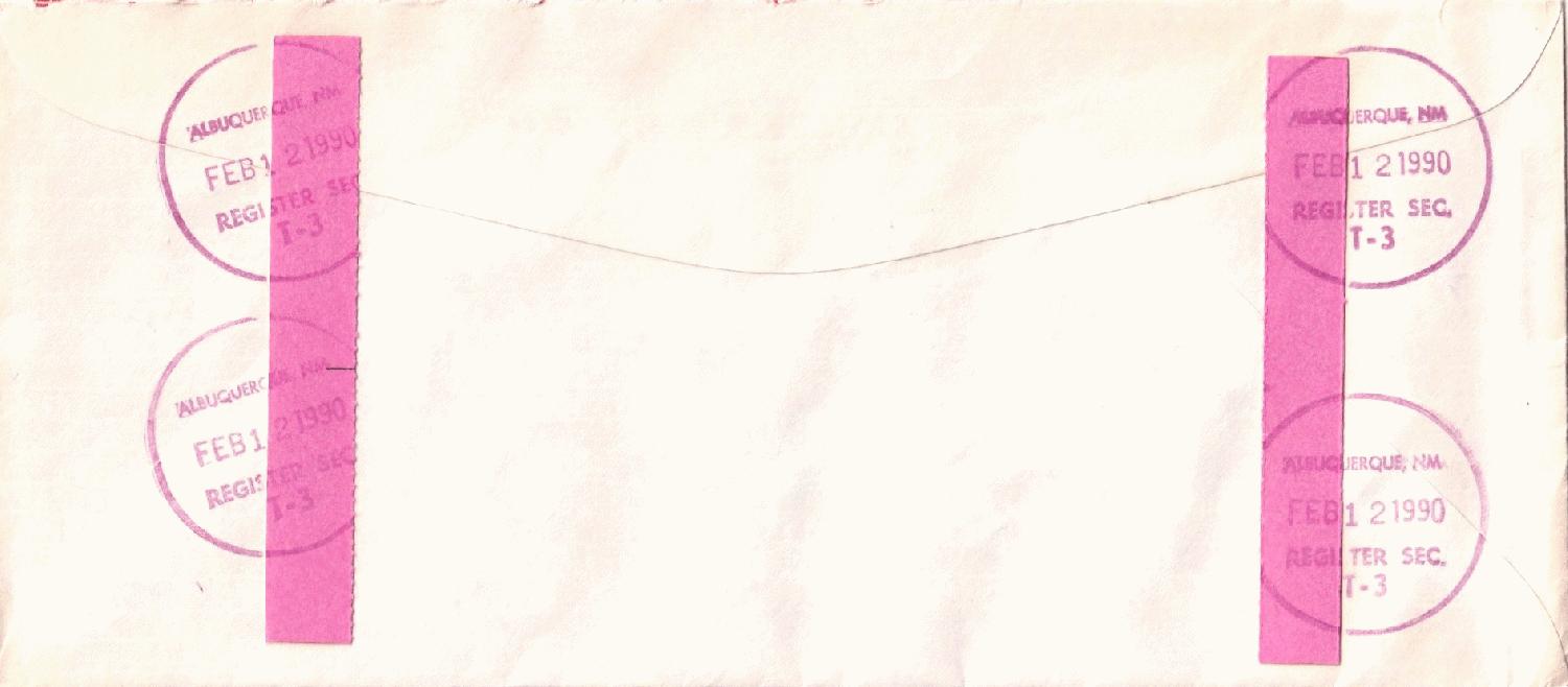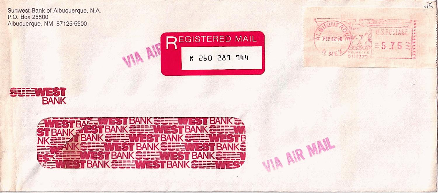 vom 12.2.1990 ein Einschreiben per Luftpost aus ALBUQUERQUE N.MEX. von der Sunwest Bank of Albuquerque. Offenbar nach den Stempeln der Rückseite zu urteilen mit Rückschein auf die Reise geschickt.