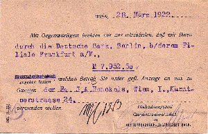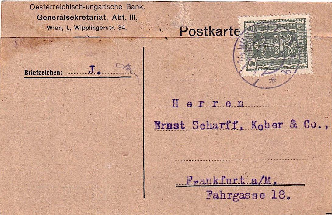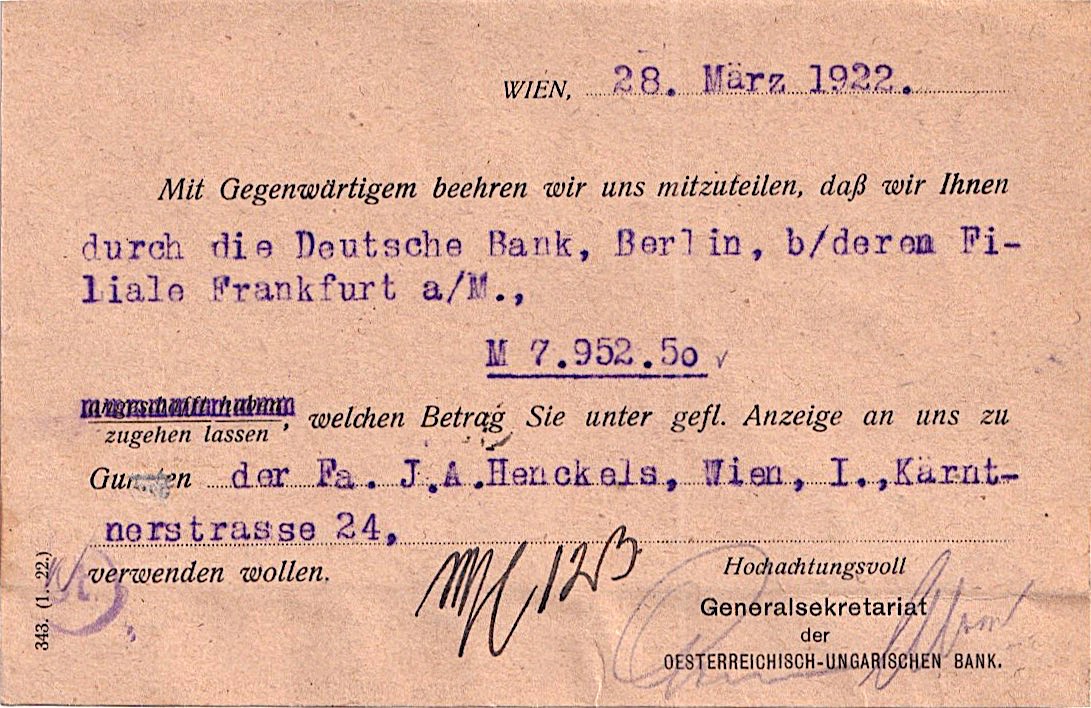 zwar nur eine Karte, aber ich denke sie wird hier auch Platz nehmen dürfen. Am 28.3.1922 versendet das Generalsekretariat der Oesterreichisch-ungarischen Bank in Wien diese Mitteilung über Zugang eines Geldbetrages durch die Deutsche Bank in Berlin, bzw. deren Filiale in Frankfurt a/M. zugunsten der Fa. J.A. Henckels, Wien an Beteiligte in Frankfurt a/M.