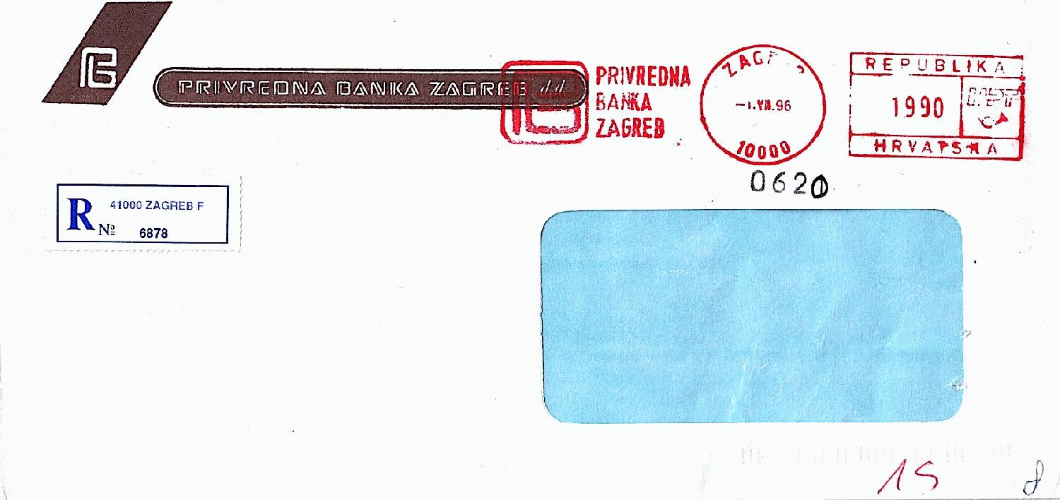 ein Einschreiben der "PRIVREDNA BANKA ZAGREB" vom 01.07.1996 aus ZAGREB / 10000. Der AFS entspricht Typ B1.1. in