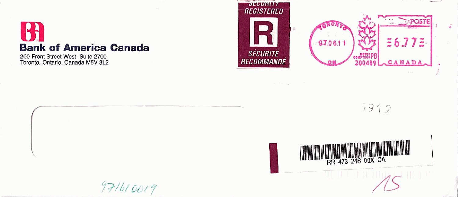 aus dem Spektrum ausländischer Bankenbelege erscheint mir dieses Einschreiben aus TORONTO, ON vom 6.11.1997 besonders bemerkenswert. Absender ist die Bank of America Canada, der auch die Pitney Bowes Maschinenkennung 200489 (Typ “A900”B) [1] sicher zugeordnet werden kann. Noch nicht sehr häufig kommt bei meinen kanadischen Belegen die Darstellung der drei aufsteigenden Ahornblätter im Stempelbild vor.