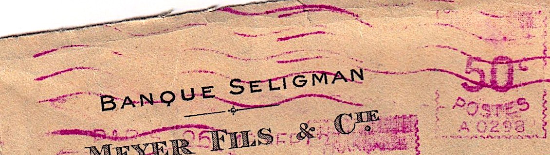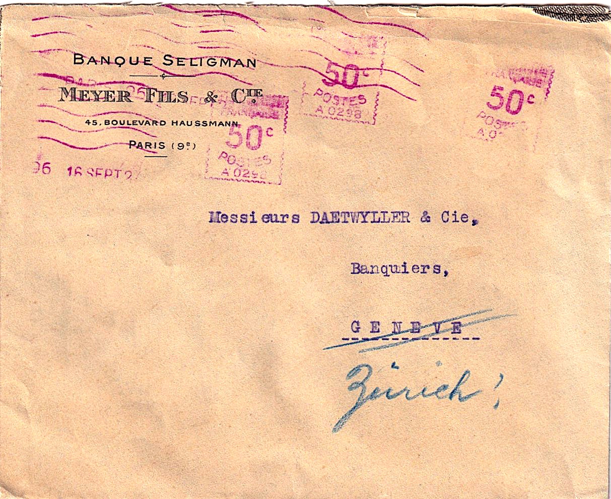 ein (versuchter?) Briefaustausch zwischen der Banque Seligman / Meyer Fils & Cie in Paris mit den Messieurs DAETWYLLER & Cie Banquiers in Genf. Die großzügige, notwendige (?) dreifache Stempelausstattung lässt allerdings an Klarheit zu wünschen übrig. Meine Deutung führt zu: PARIS 96 vom 16.9.1927 mit einer Maschinenkennung A 0298.