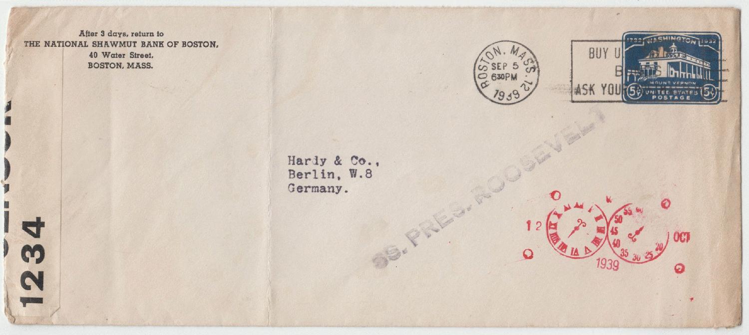 Ein Brief - Ganzsache der USA von 1932 - der National Shawmut Bank of Bosten an das Bankhaus Hardy & Co. in Berlin. Aufgabe am 5.9.1939, befördert wohl mit USS Pres. Roosevelt, Eingang beim Empfänger am 12.10.1939. Geöffnet von der US Zensur.