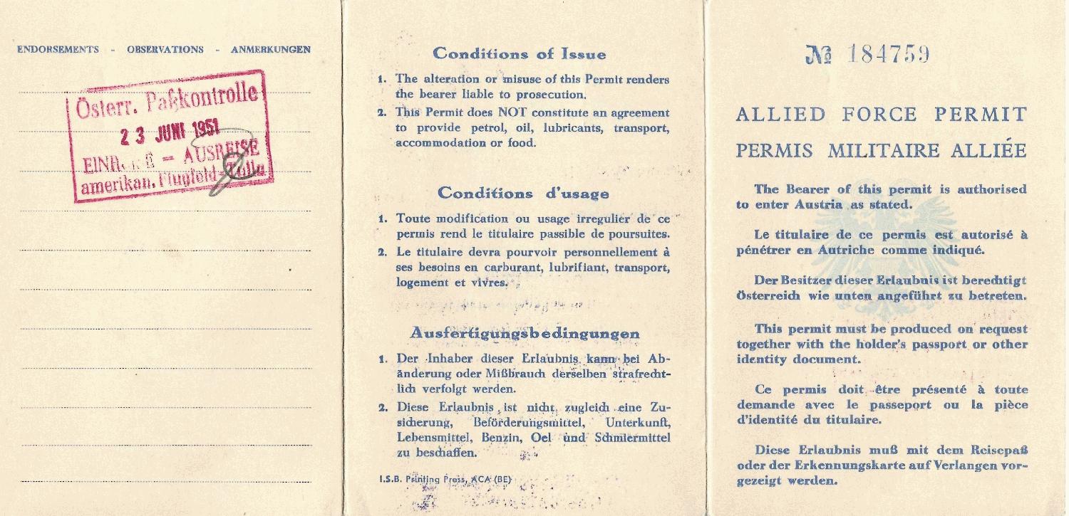 Dreiteilige Erlaubniskarte für die Ein- und Ausreise (Fernflug) nach Österreich, ausgestellt im Juni 1951 im Kombinierten Reise-Büro BERLIN, die Gebühr entrichtet mit einer Fiskalmarke zu 8 DM, das Flugzeug landete seinerzeit auf dem amerikanischen Flugfeld in Tulln.