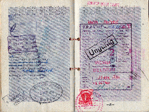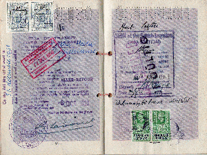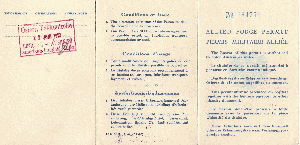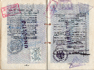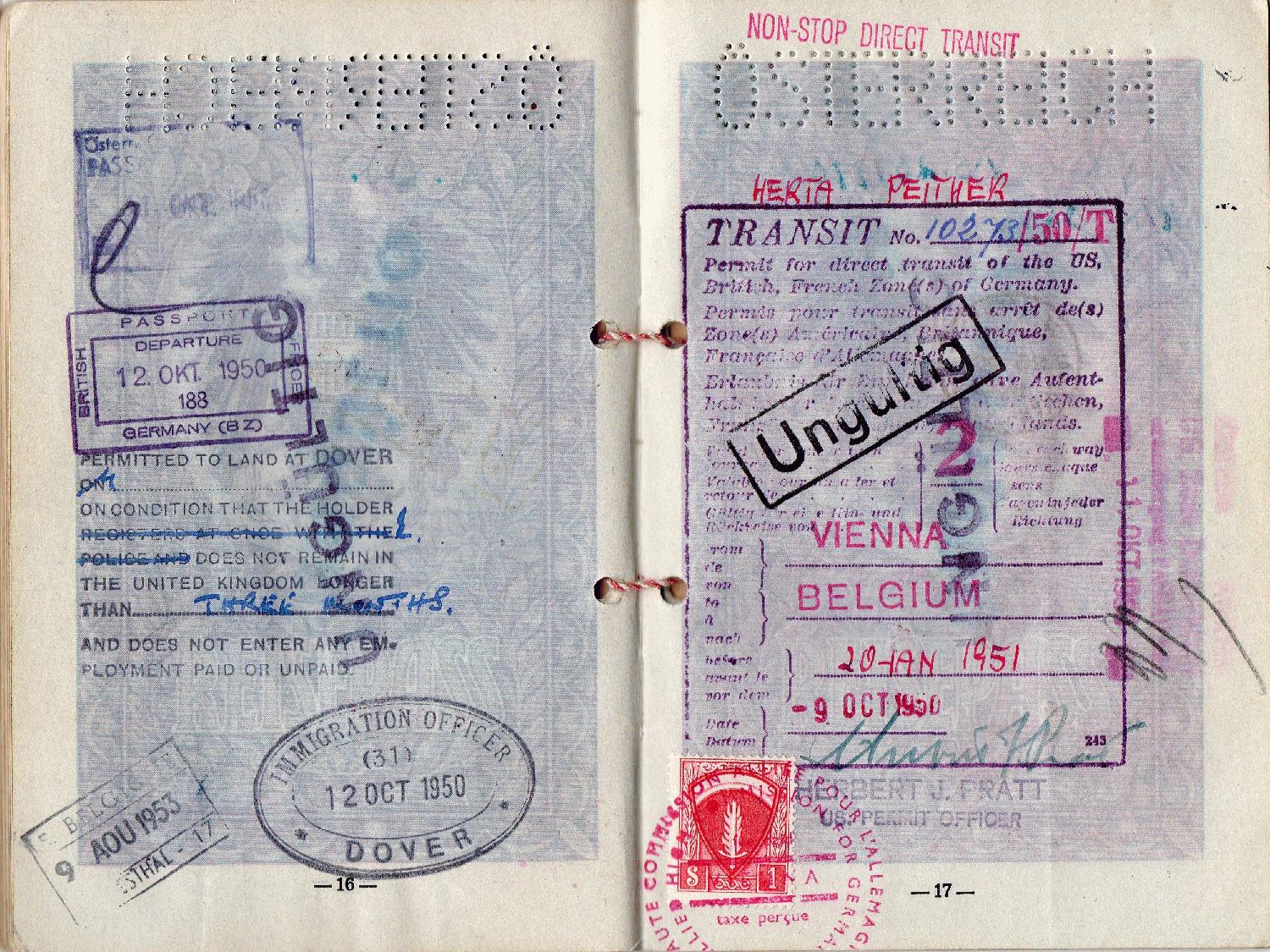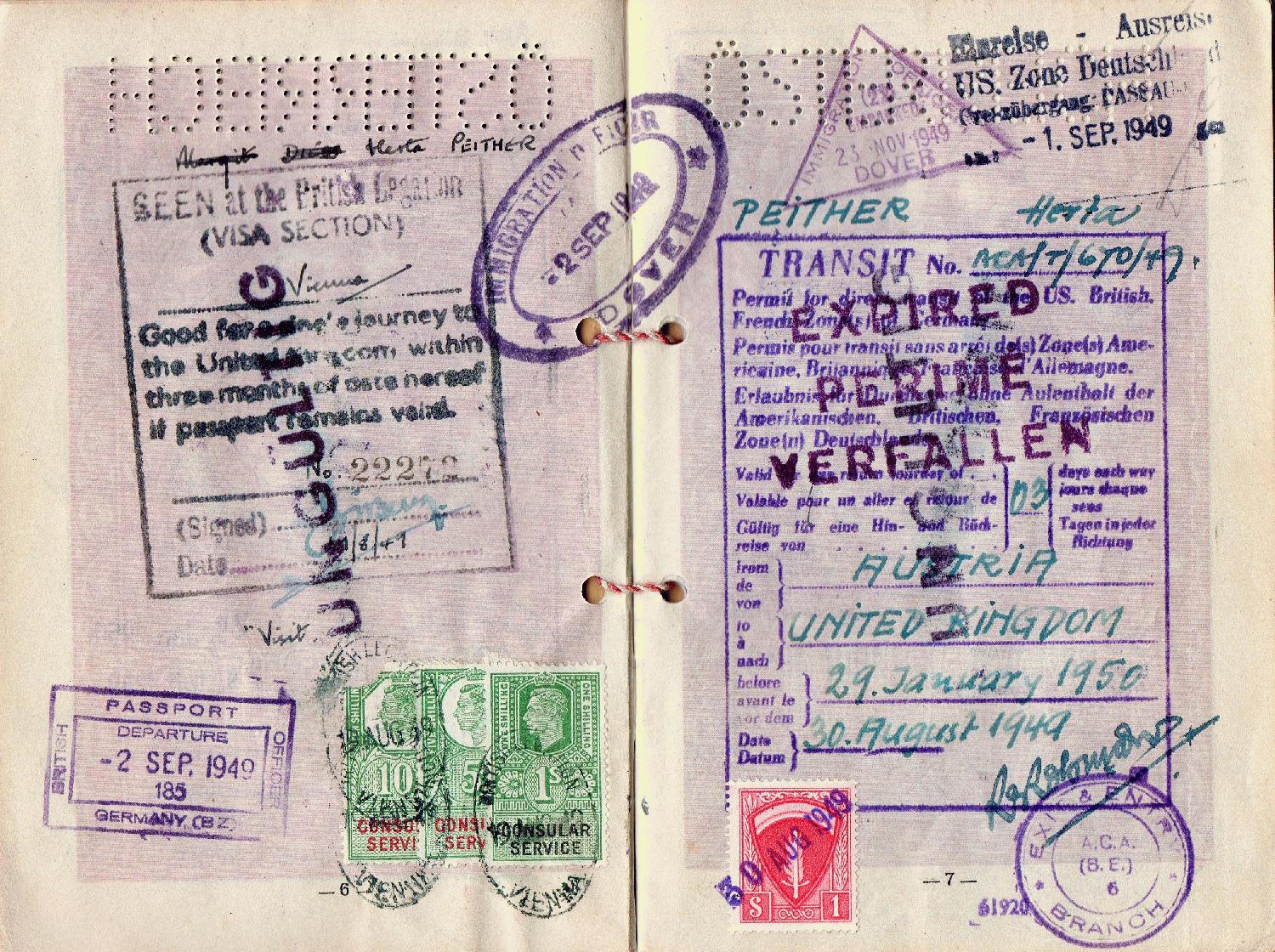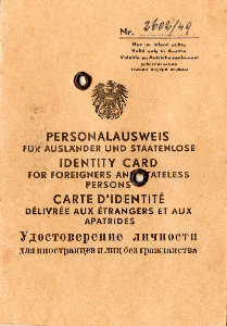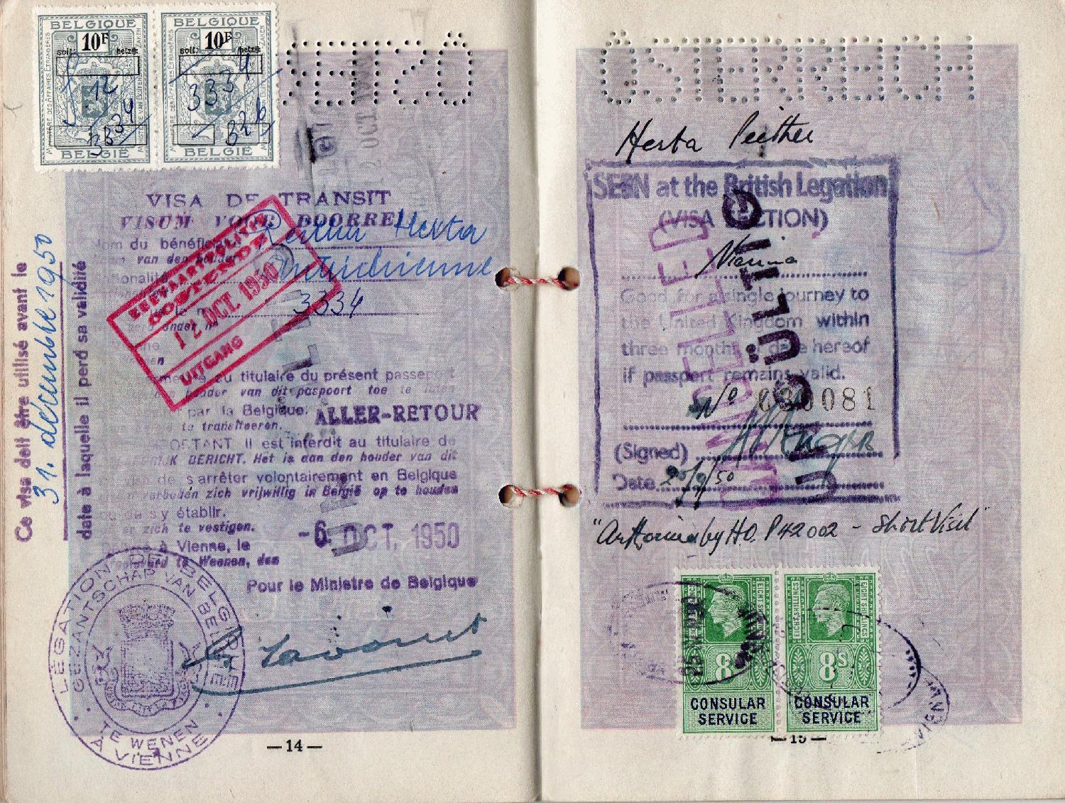 Ausweis einer österreichischen Studentin vom Juli 1949, sie beantragte u.a. zwei alliierte Visa (Stempelmarken zu 1 US-$) im August 1949 sowie im Oktober 1950 für (Studien-) Reisen nach Großbritannien und Belgien. Für einen weiteren Besuch von GB wurde im März 1951 ein letztes Visum erstellt, hier kam aber keine AMG-Stempelmarke mehr zum Einsatz.