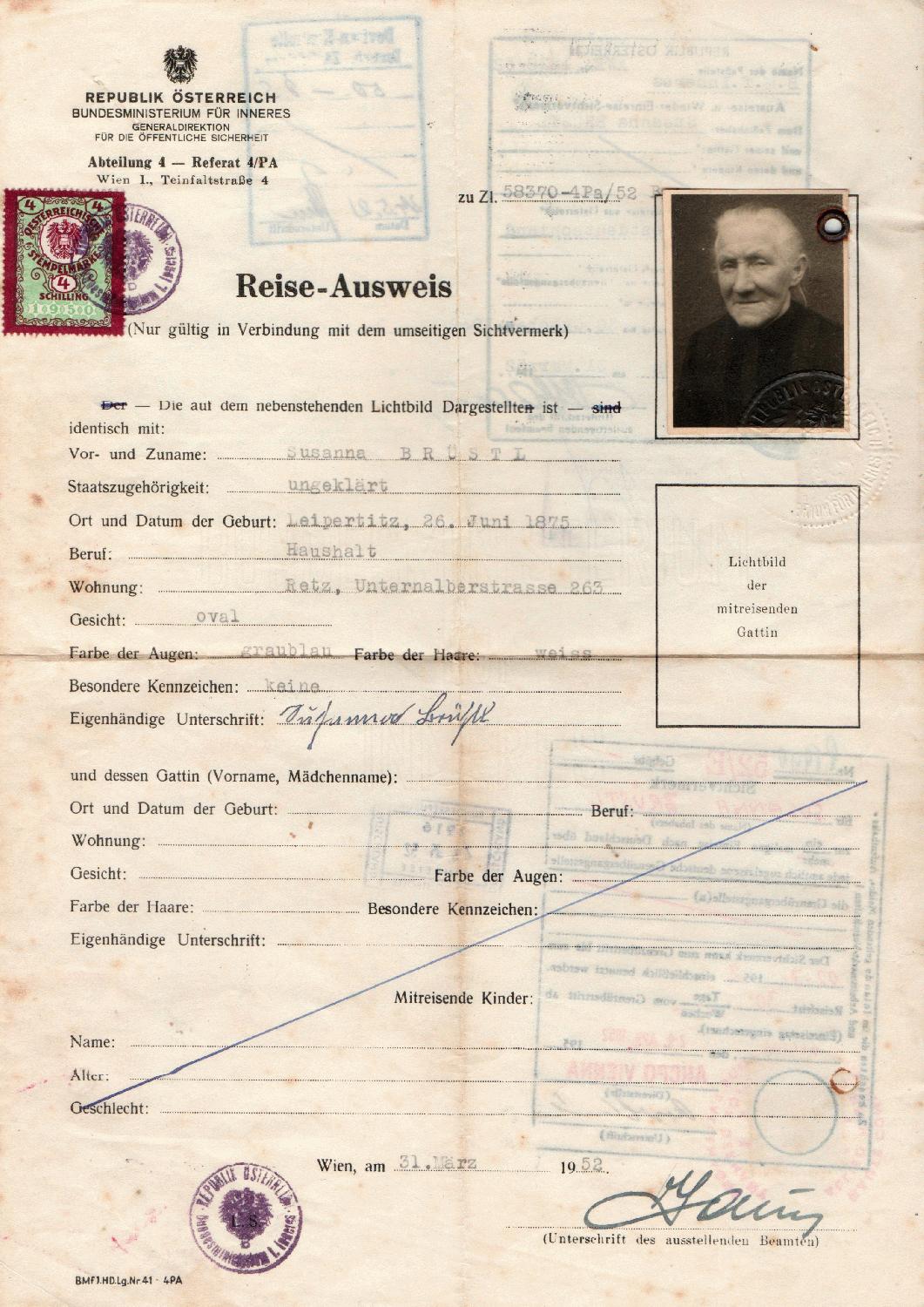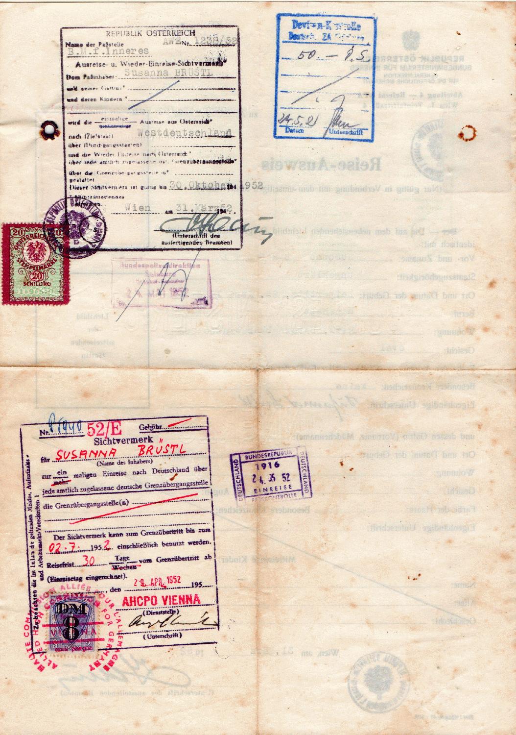 Für einen einmaligen Besuch in die benachbarte Bundesrepublik beantragte das Fräulein Brüstel zuerst einen Personalausweis, dazu kam ein separater Reise-Ausweis und sie benötigte auch noch eine alliierte Reisegenehmigungsmarke zu 8 DM, um im Zeitraum von April bis Juli 1952 zu ein- und auszureisen, seinerzeit eine ziemlich teure Angelegenheit.