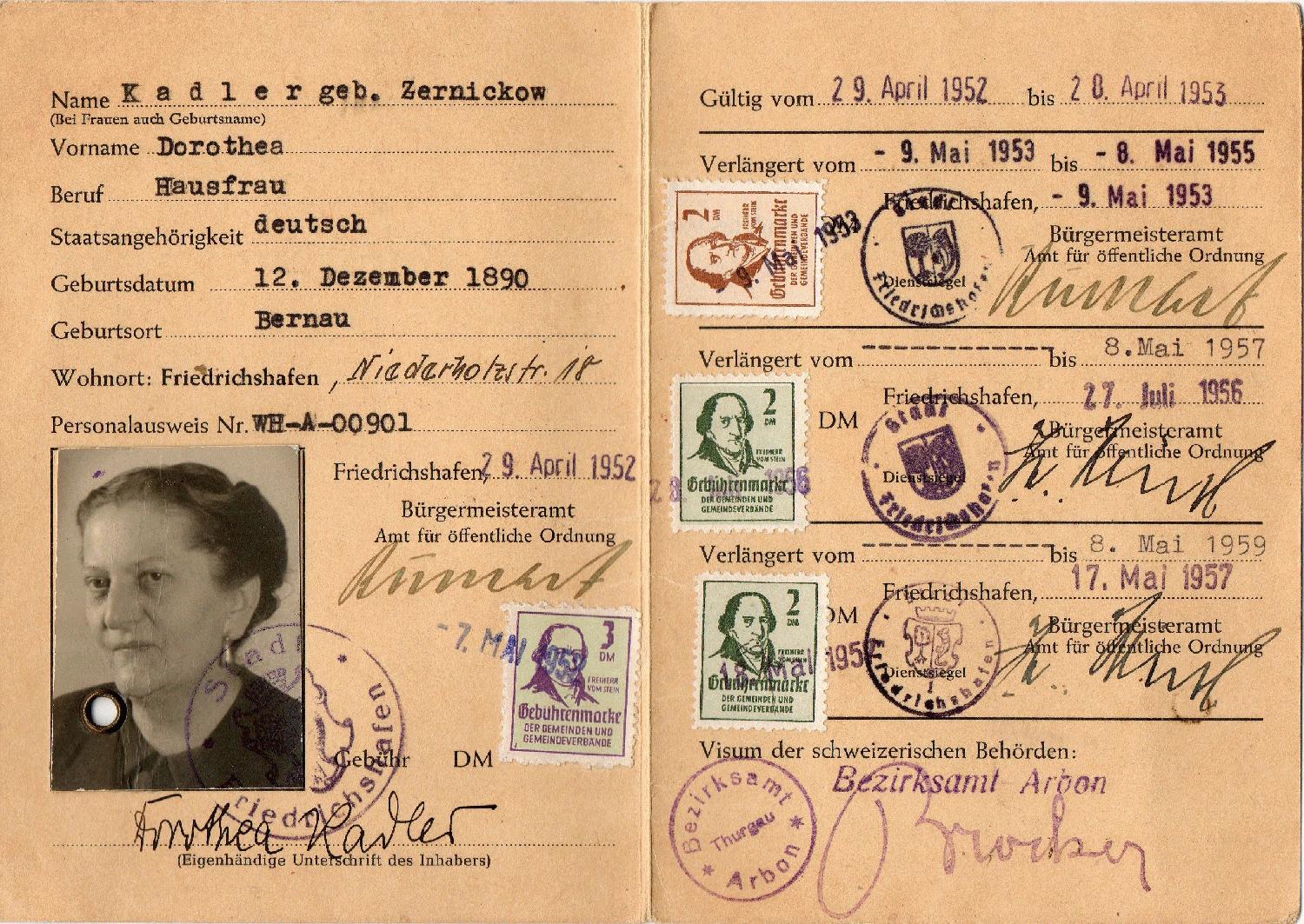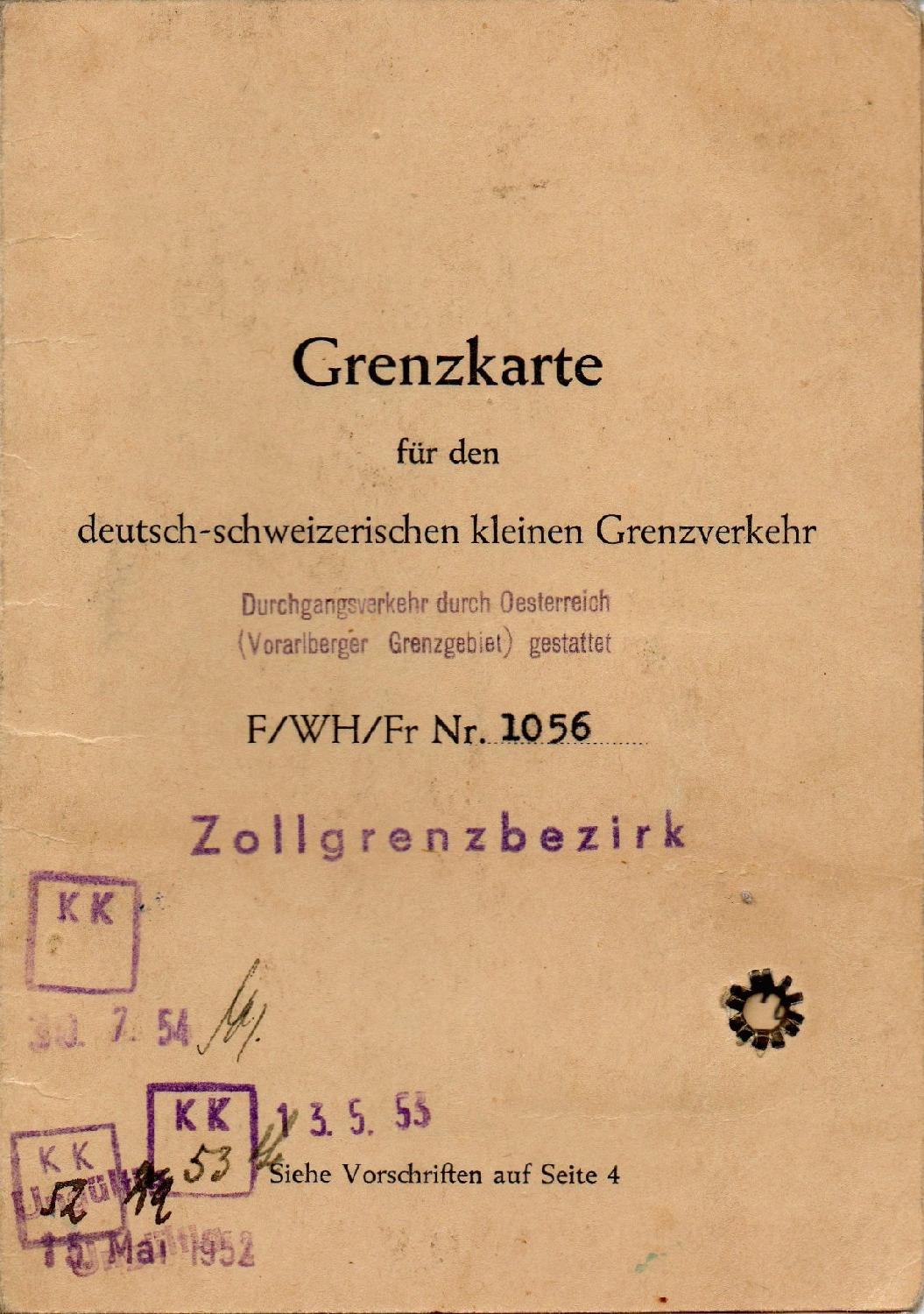 Es handelt sich um eine Grenzkarte, die einer deutschen Bürgerin im April 1952 in Friedrichshafen ausgestellt wurde, die jeweilige Gebühr wurde mit den seinerzeit von vielen Gemeinden genutzten Stempelmarken "Freiherr vom Stein" ausgewiesen.
