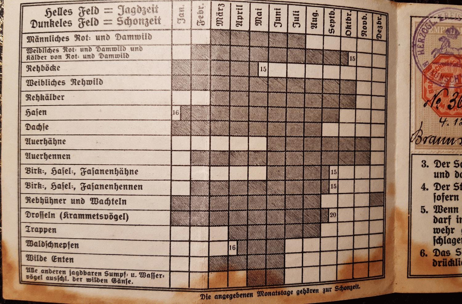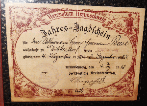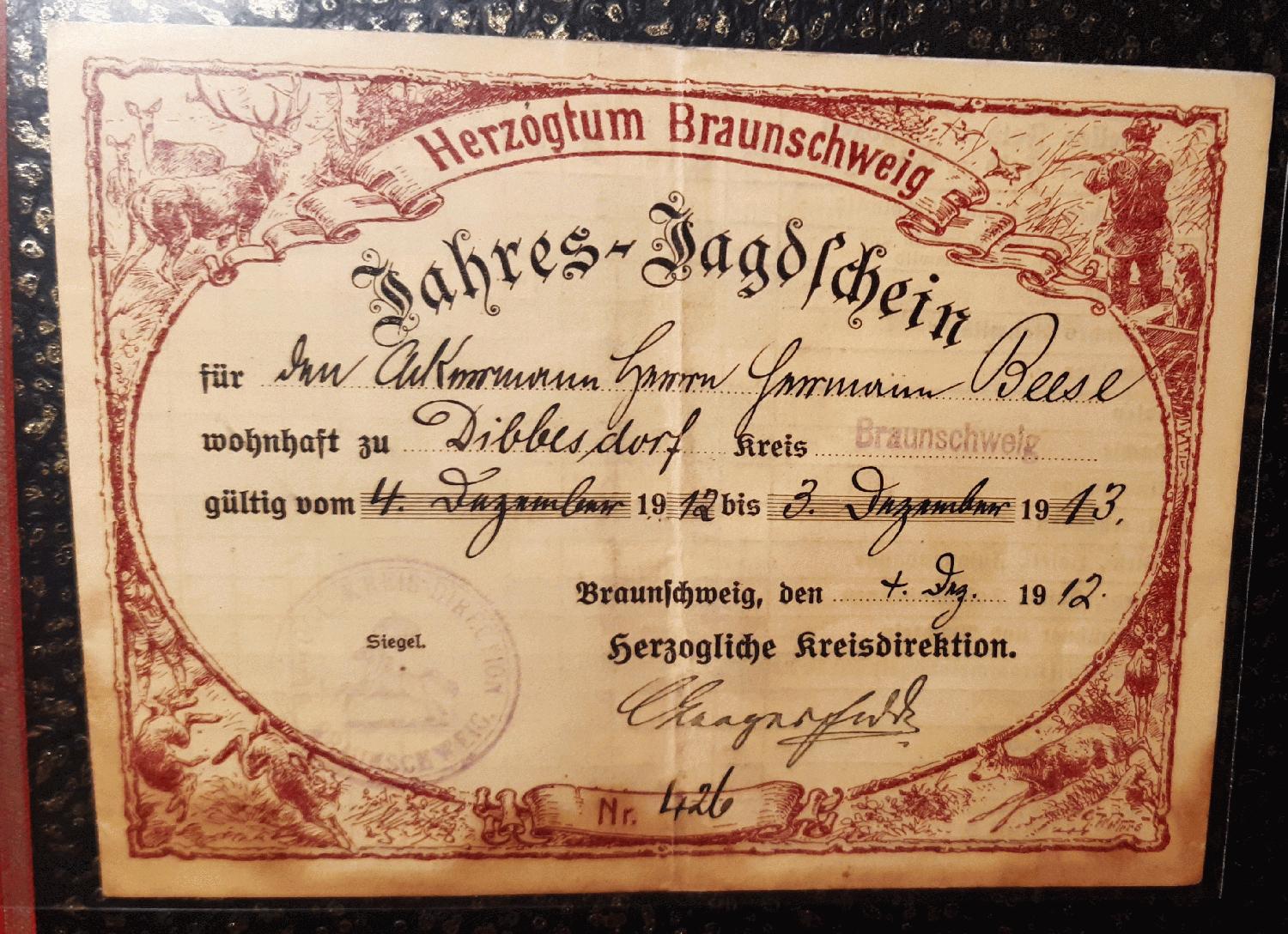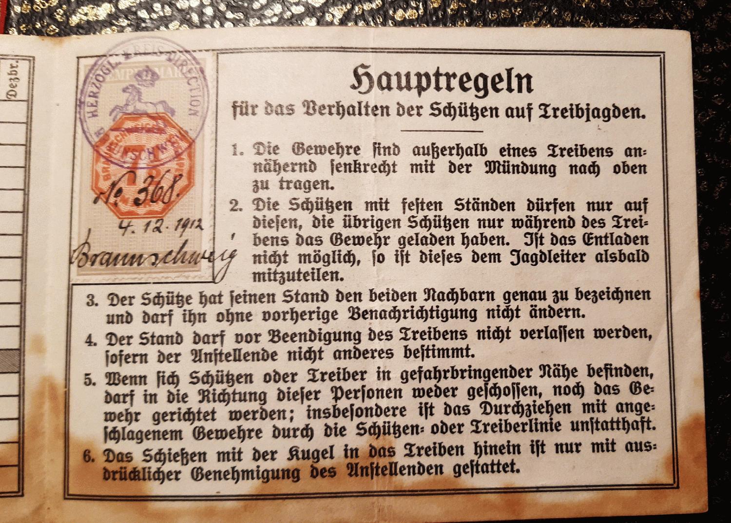 Von mir mal ein Jahres-Jagdschein des Herzogtums Braunschweig des Jahres 1912 mit Stempelmarke 7 1/2 Mark. Sicher nicht mehr so schön anzusehen.